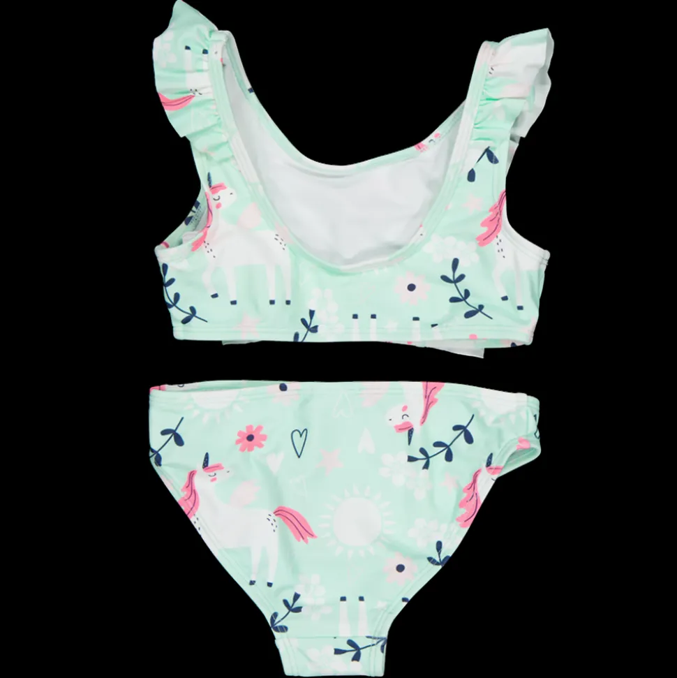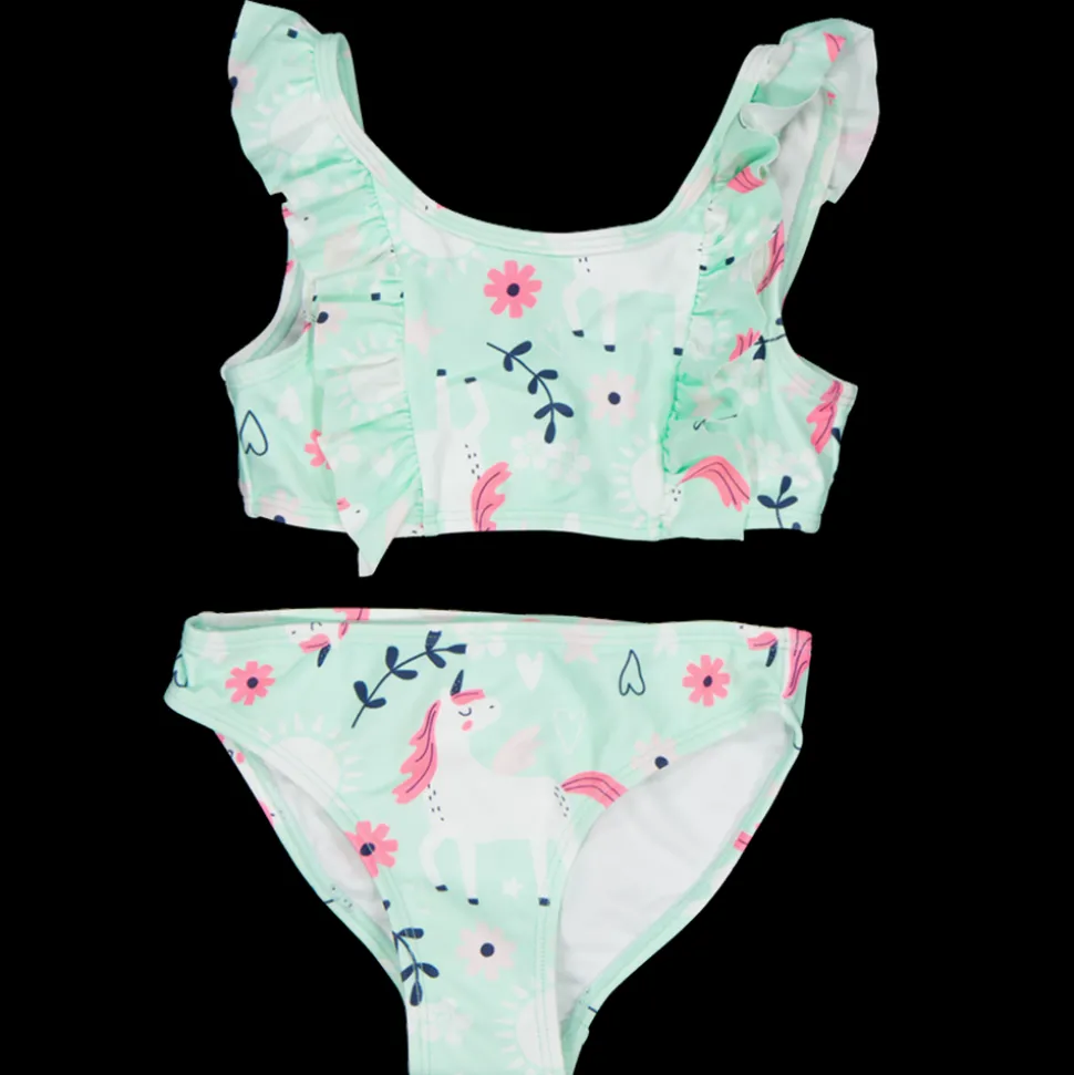 Deze bikini is ideaal voor kinderen. Het topje heeft vrolijke ruffles en een schattig patroon met eenhoorns en bloemen. Gemaakt van 80% polyamide en 20% elastaan, biedt het comfort en een goede pasvorm. De binnenvoering is van 100% polyester. Geniet van het water met deze leuke bikini.