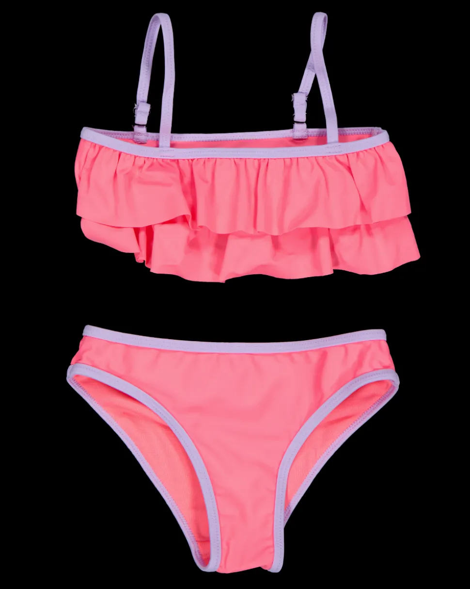 Deze roze bikini voor meisjes heeft een bovenstuk met ruches en verstelbare bandjes. De stof bestaat voor 80% uit polyamide en 20% uit elastaan, met een voering van 100% polyester. De bikini is geschikt om te dragen tijdens wateractiviteiten.