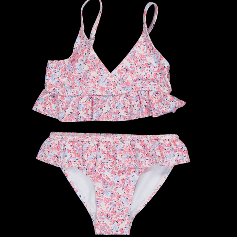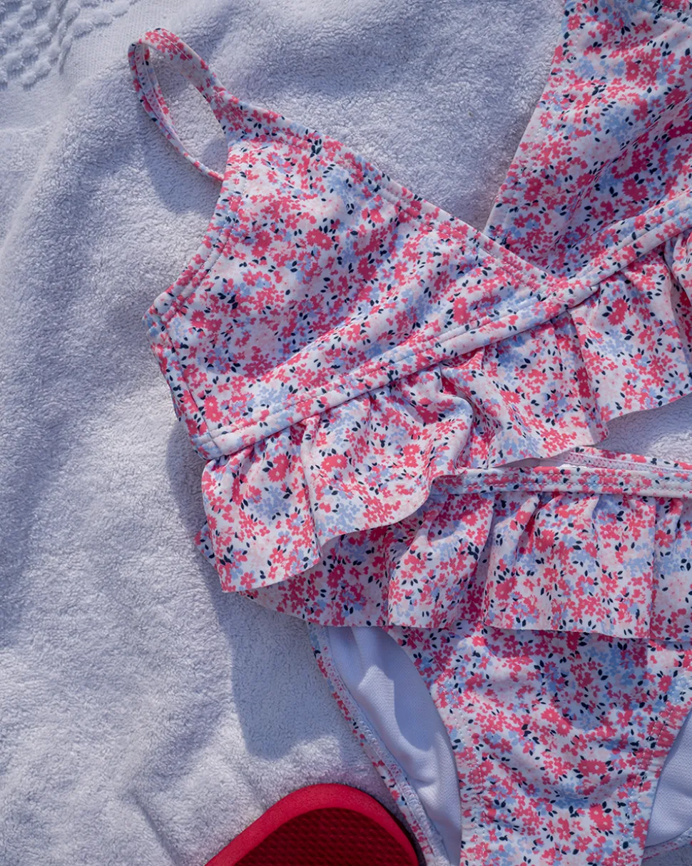 Dit setje bikini voor meisjes is leuk met een vrolijk all-over bloemenpatroon. Het is gemaakt van een comfortabele mix van polyamide en elastaan, wat zorgt voor een goede pasvorm. De top heeft schattige ruffles en verstelbare bandjes. Perfect voor plezier in het water.