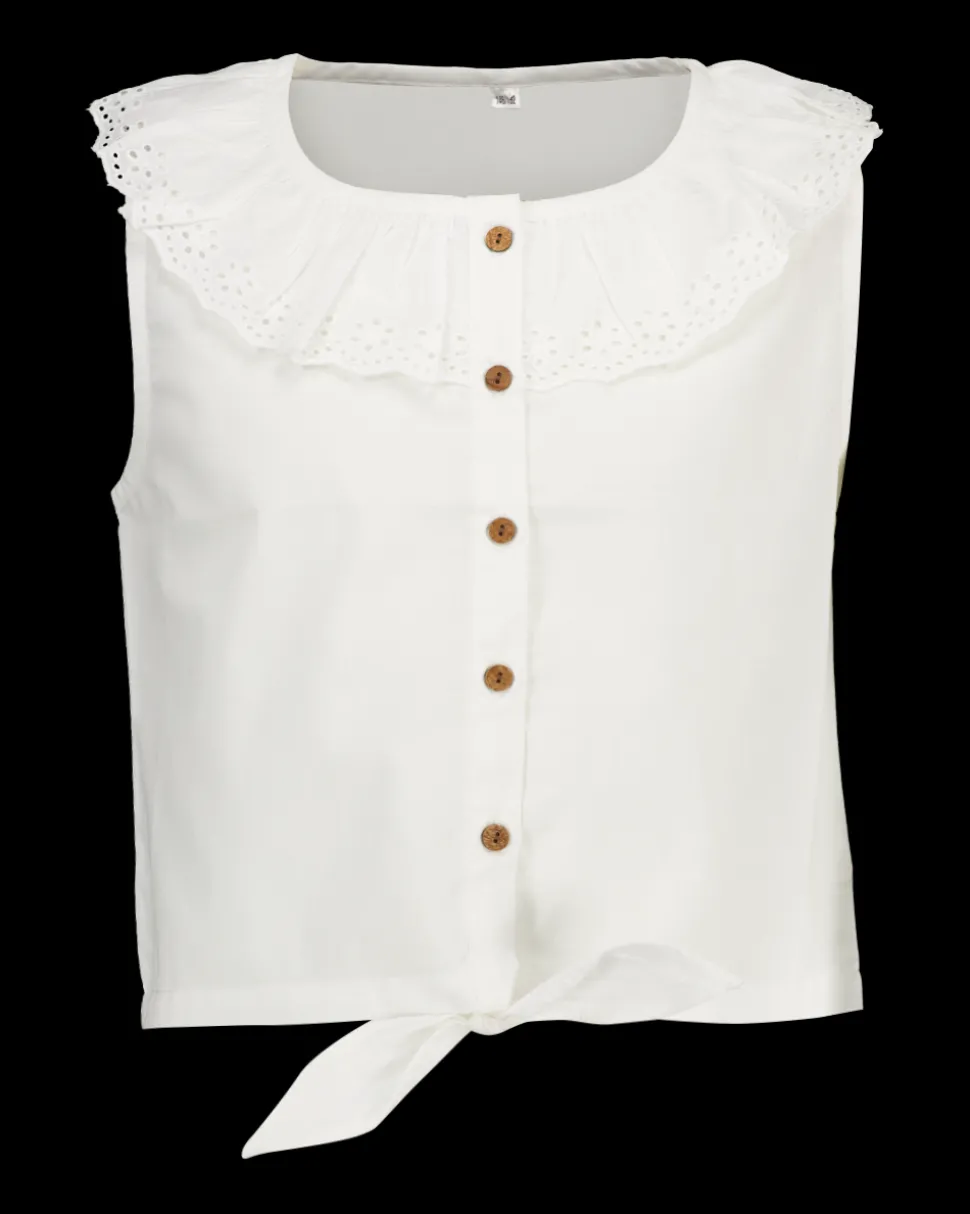 Deze witte blouse voor meisjes is gemaakt van 100% katoen. De blouse heeft een knoopsluiting en een geborduurde kraag. Onderaan zit een strik die je kunt vastmaken. Het materiaal voelt natuurlijk aan en is geschikt voor verschillende stijlen.