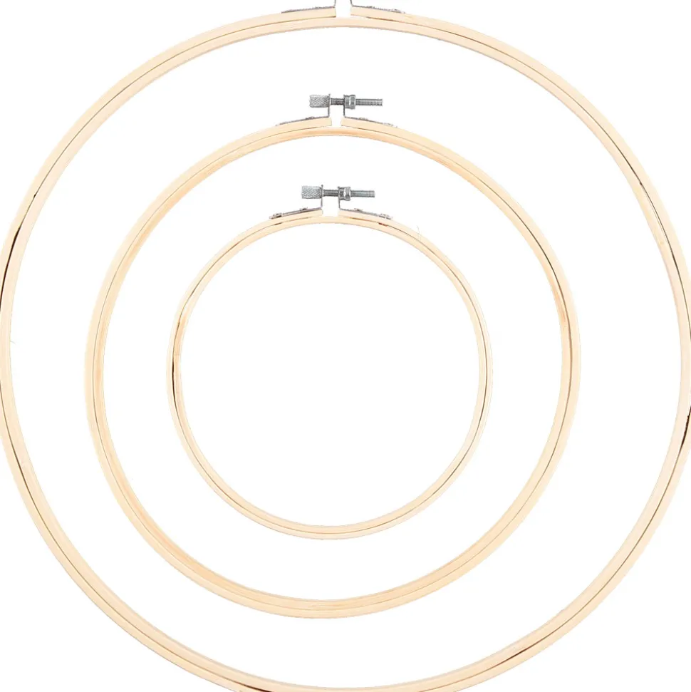 Een set van 3 bamboe borduurringen. De ringen hebben een diameter van 15 cm, 23 cm en 33 cm.