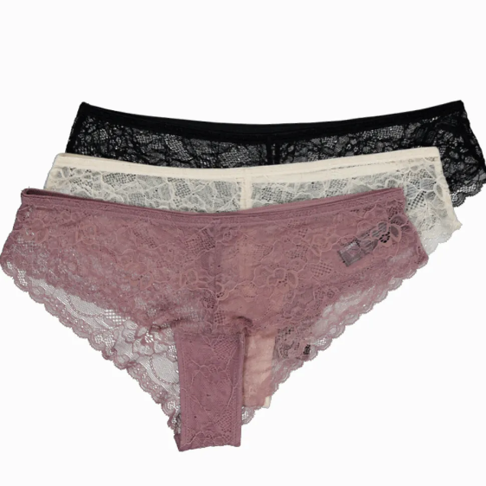 Deze set van drie Brazilian slipjes in bruin tinten voelt heerlijk aan door de zachte kant. De slipjes zijn gemaakt van kant, wat zorgt voor een mooie uitstraling. Met verschillende kleuren heb je altijd een passende optie bij je outfit. Geniet van comfort en stijl met deze veelzijdige slipjes.