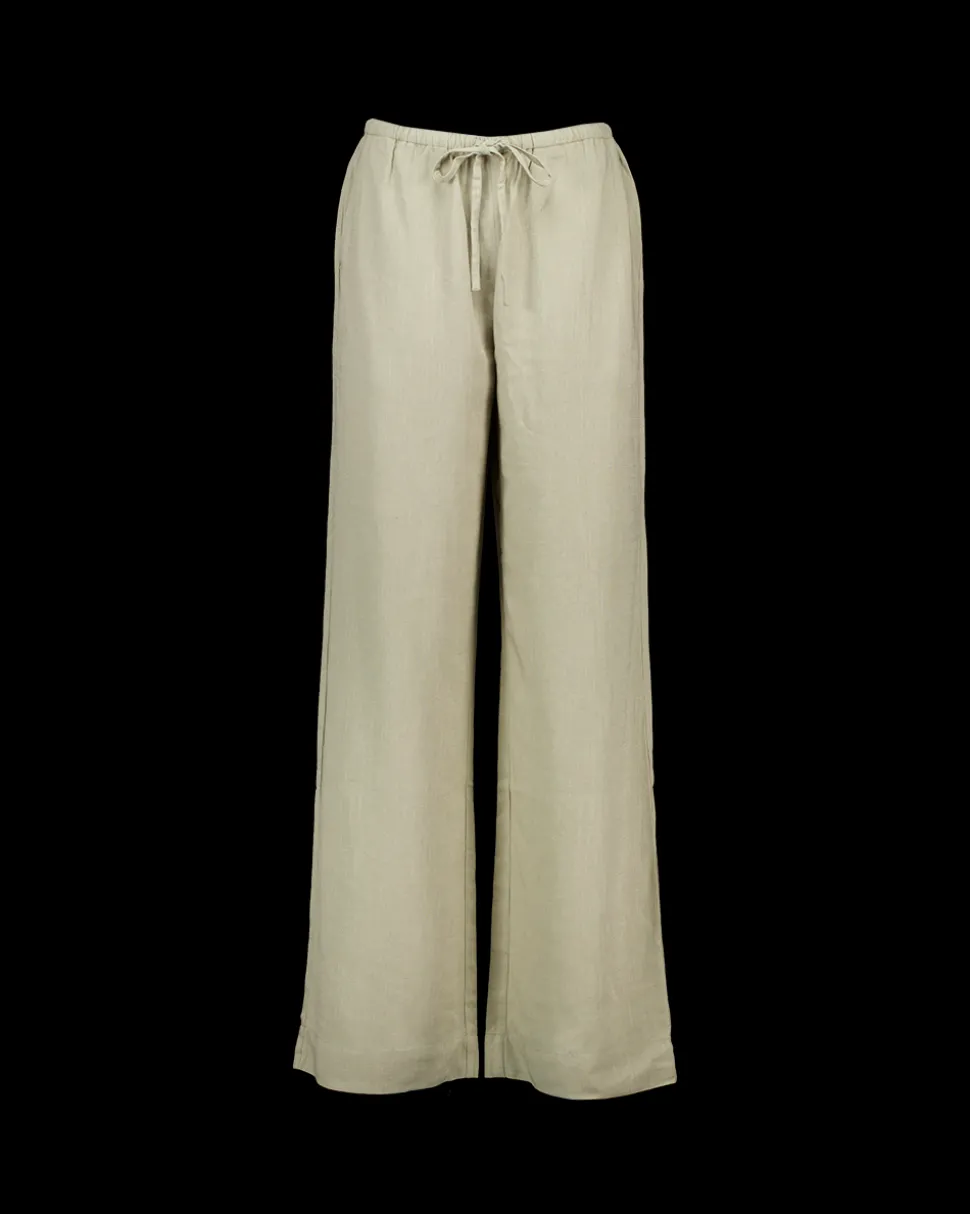 Deze groene broek is gemaakt van 85% viscose en 15% linnen, wat zorgt voor een lichte en ademende stof. De elastische tailleband met strik zorgt voor een comfortabele fit. De broek heeft een losse pasvorm, waardoor je vrij kunt bewegen. Handig voor verschillende looks.