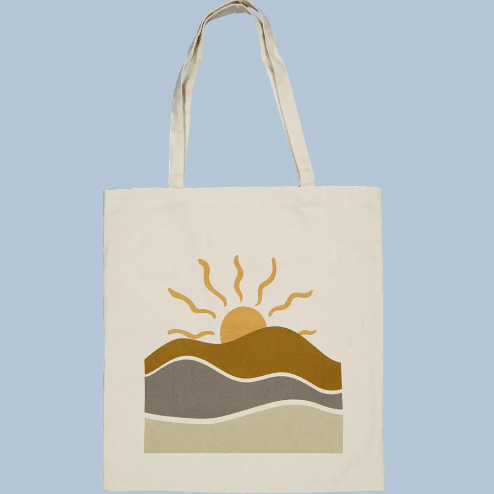 Deze canvas tas met zon- en bergmotief is een praktische keuze voor dagelijkse boodschappen of een dagje uit. Gemaakt van 100% katoen, is de tas stevig en gemakkelijk te dragen dankzij de lange handvatten. Het witte ontwerp met warme kleuren geeft een frisse uitstraling en voegt iets extra's toe aan je outfit.