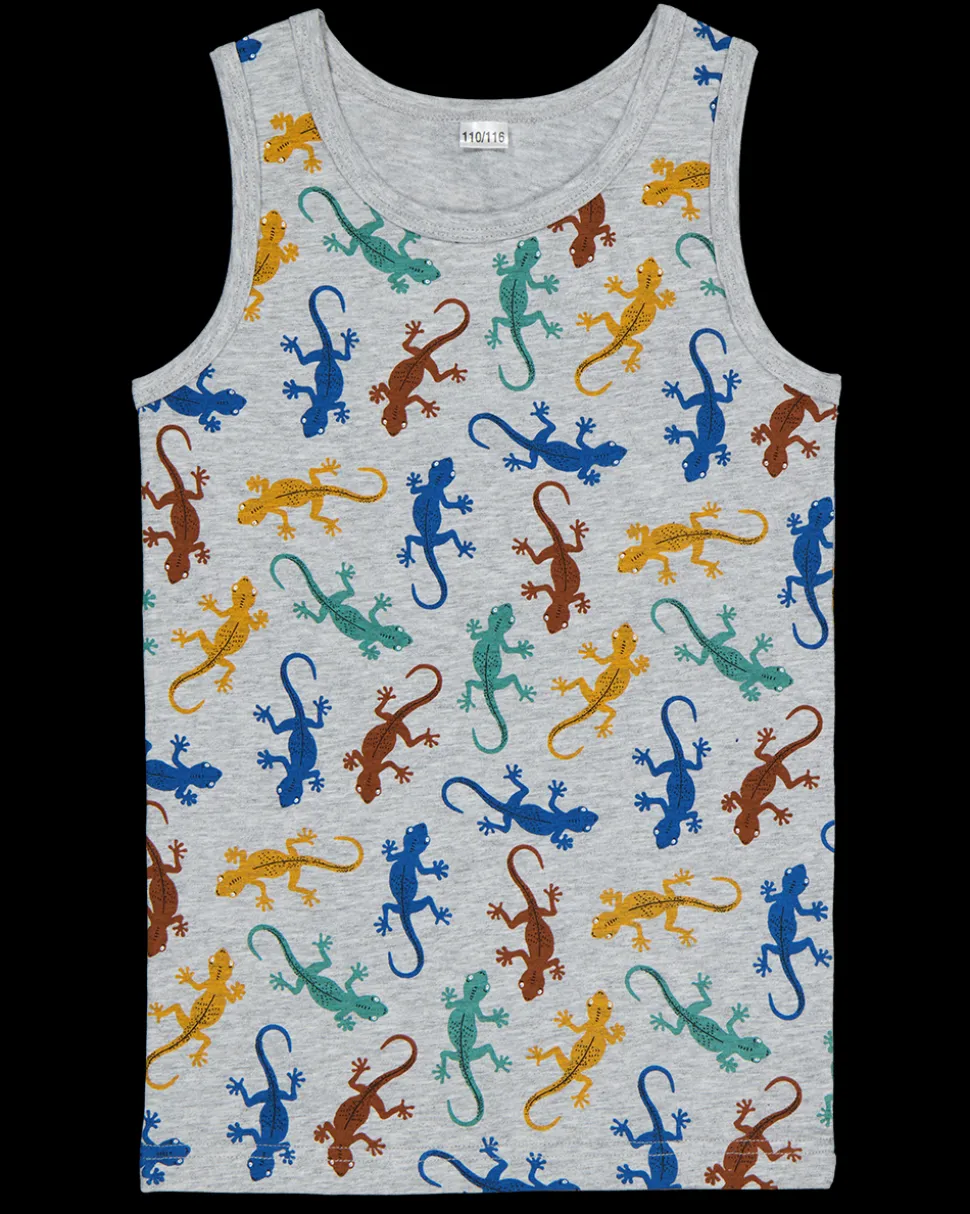 Dit grijze hemd voor jongens heeft een vrolijke print met gekleurde hagedissen. Het is gemaakt van katoen met een klein aandeel elastaan, wat zorgt voor een comfortabele pasvorm. Je draagt het bijvoorbeeld onder een shirt of los op warme dagen.