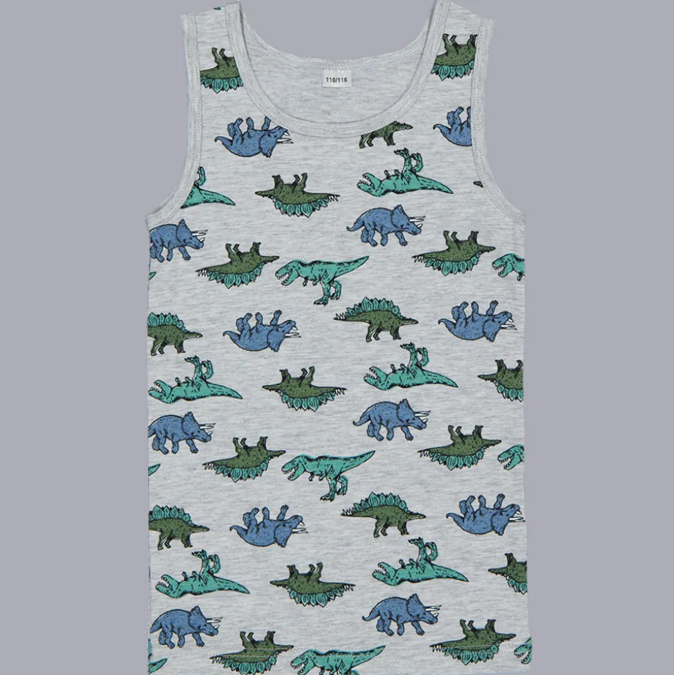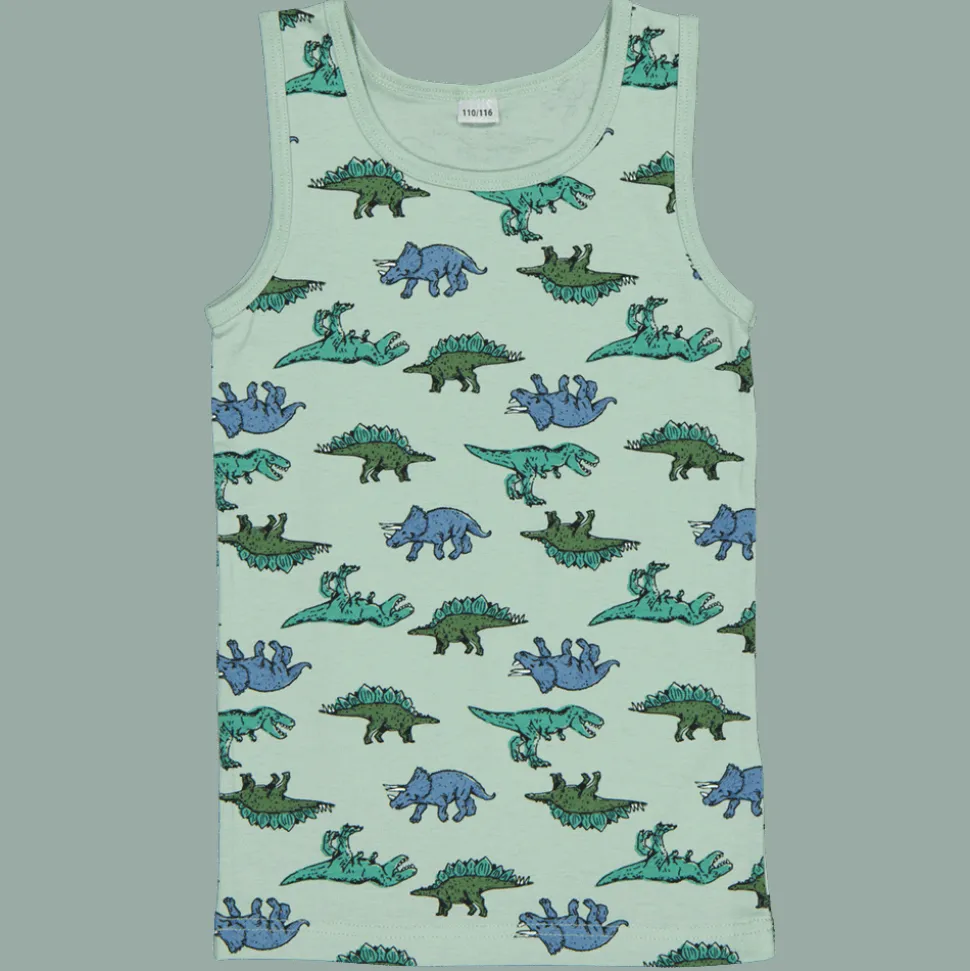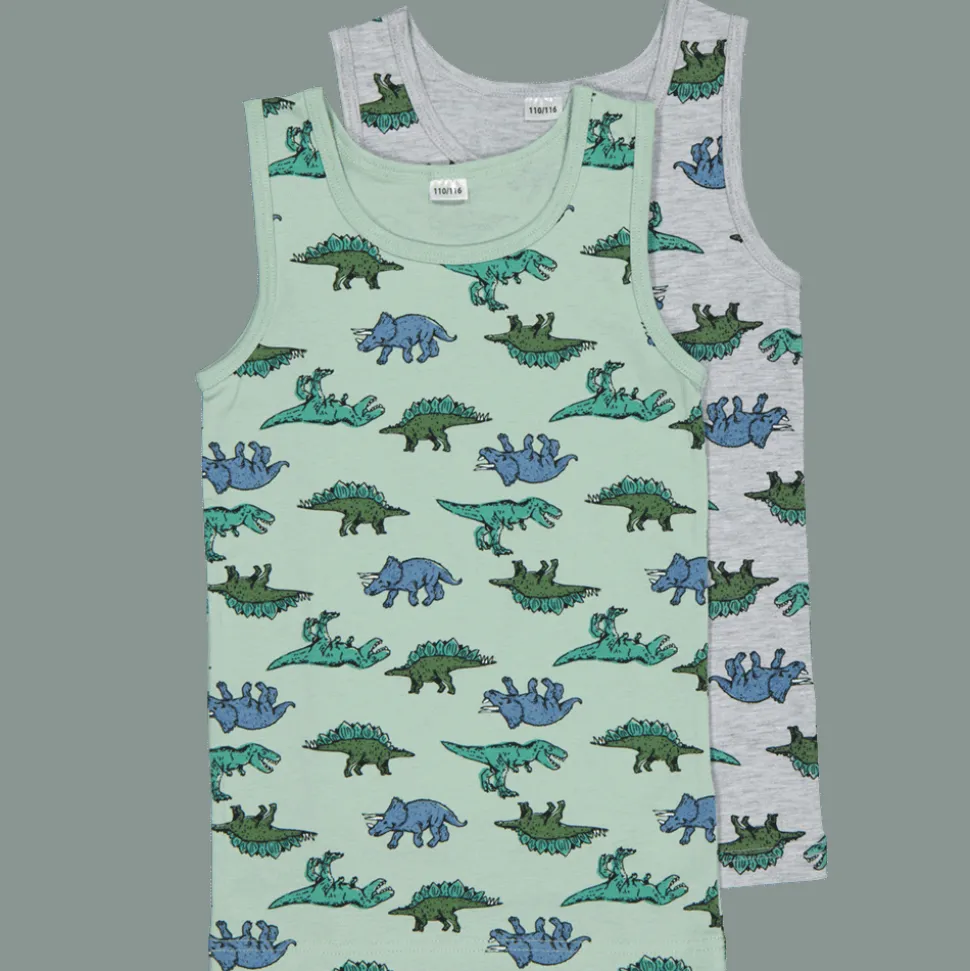 Deze groene hemden voor jongens hebben een dessin met verschillende dinosaurussen. Ze zijn gemaakt voor kinderen en komen in een set van twee stuks. De mouwloze hemden bieden een comfortabele pasvorm voor warme dagen.