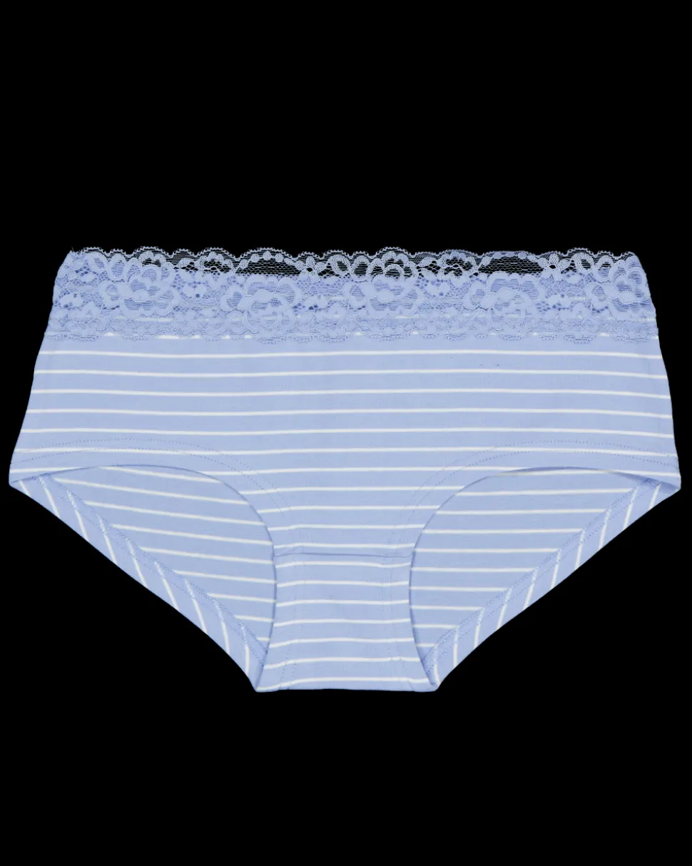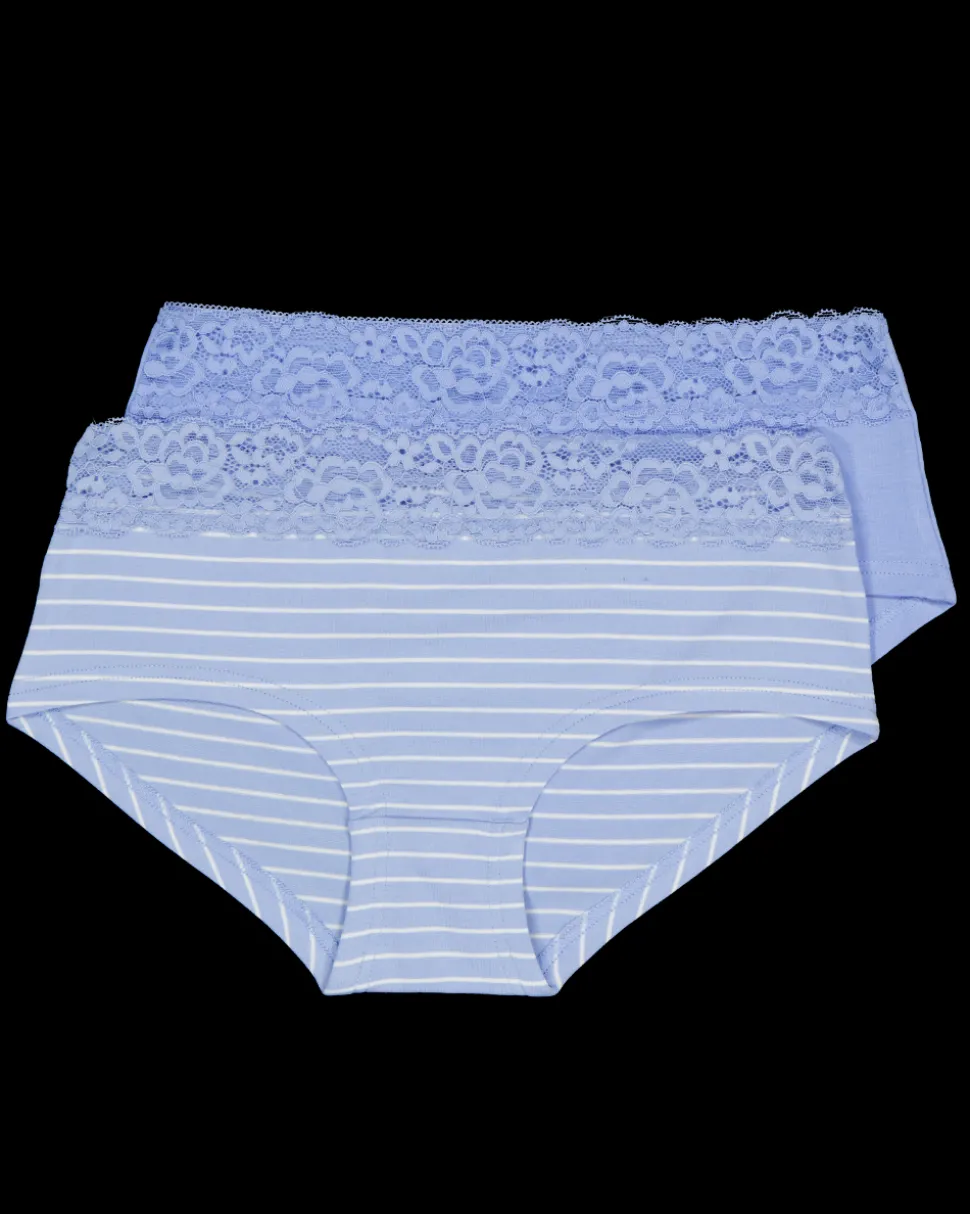 Deze hipsters voor vrouwen zijn blauw en hebben een kanten rand. Ze zijn gemaakt van katoen met een beetje elastaan voor extra comfort. Door de zachte stof sluiten ze goed aan en bieden ze een fijne pasvorm. Je krijgt twee stuks in één verpakking.
