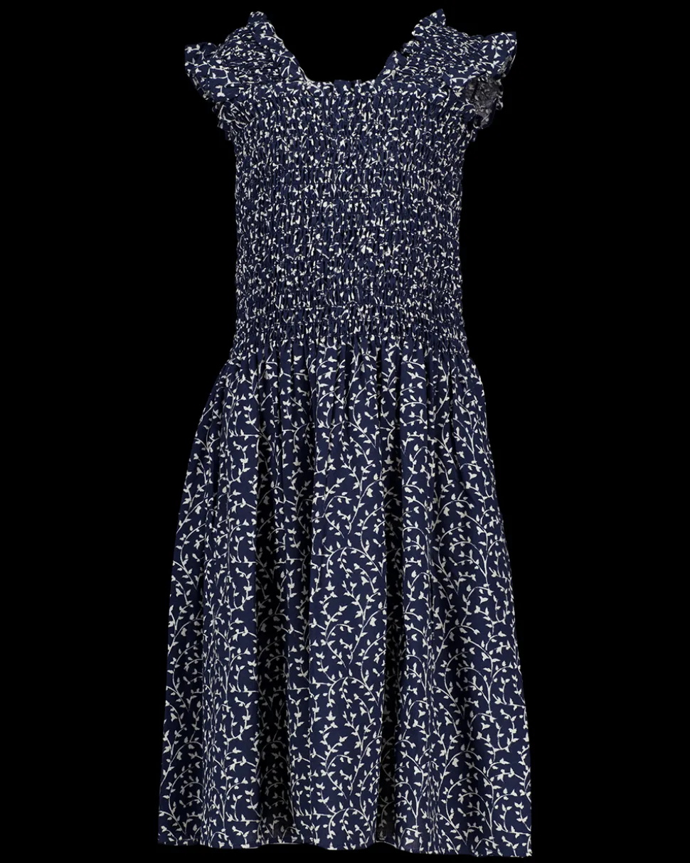 Deze blauwe jurk voor meisjes is gemaakt van 100% viscose. De jurk heeft een gerimpeld bovenstuk en een losvallende rok. Door het licht ademende materiaal draagt de jurk prettig bij verschillende temperaturen. De jurk heeft korte mouwen met een lichte volant.