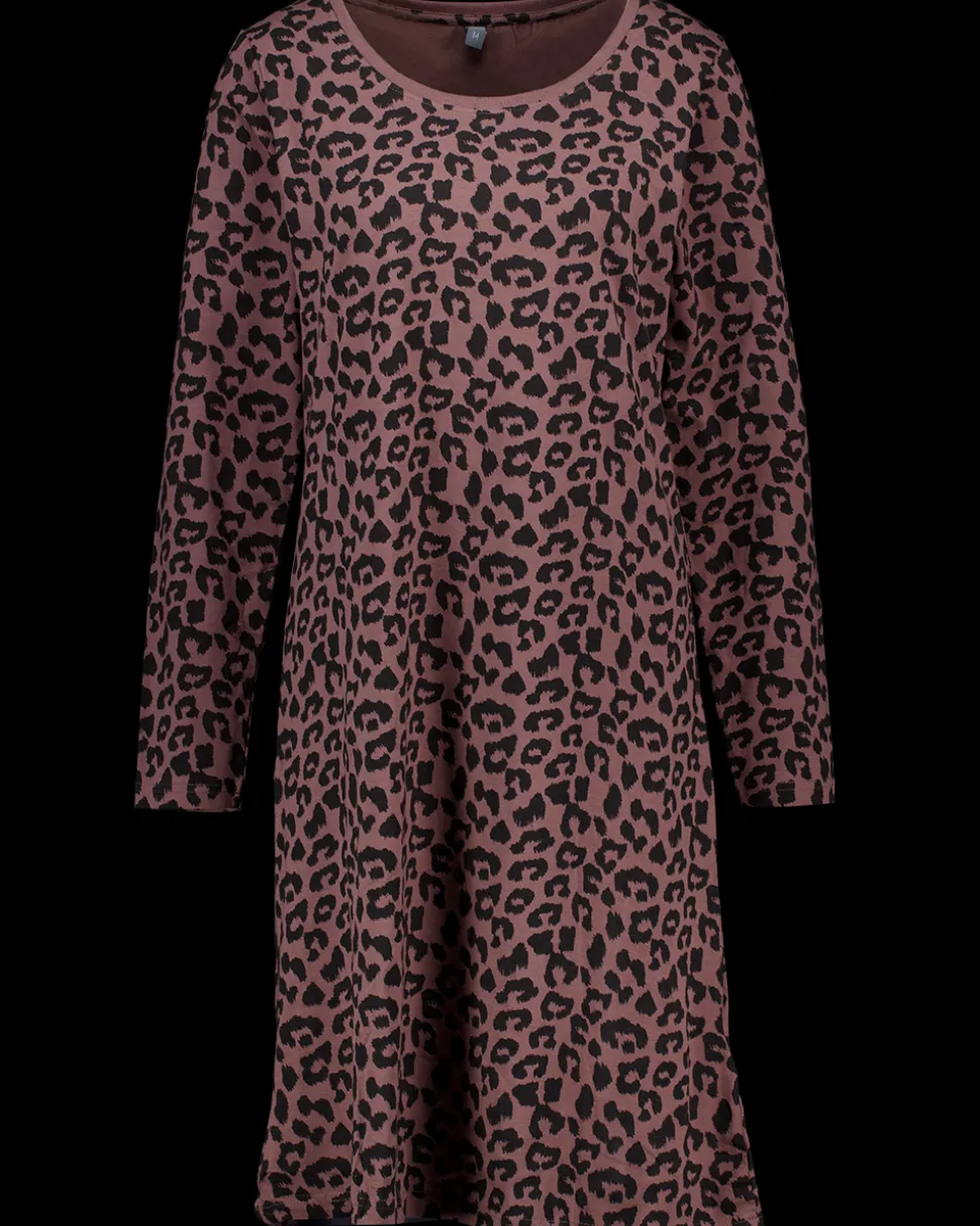 Dit nachthemd voor vrouwen is bruin met een zwart dierenprint. Het heeft lange mouwen en is gemaakt van katoen met een beetje elastaan. Hierdoor draagt het comfortabel en heeft het een lichte rek. Het biedt voldoende bedekking voor een goede nachtrust.