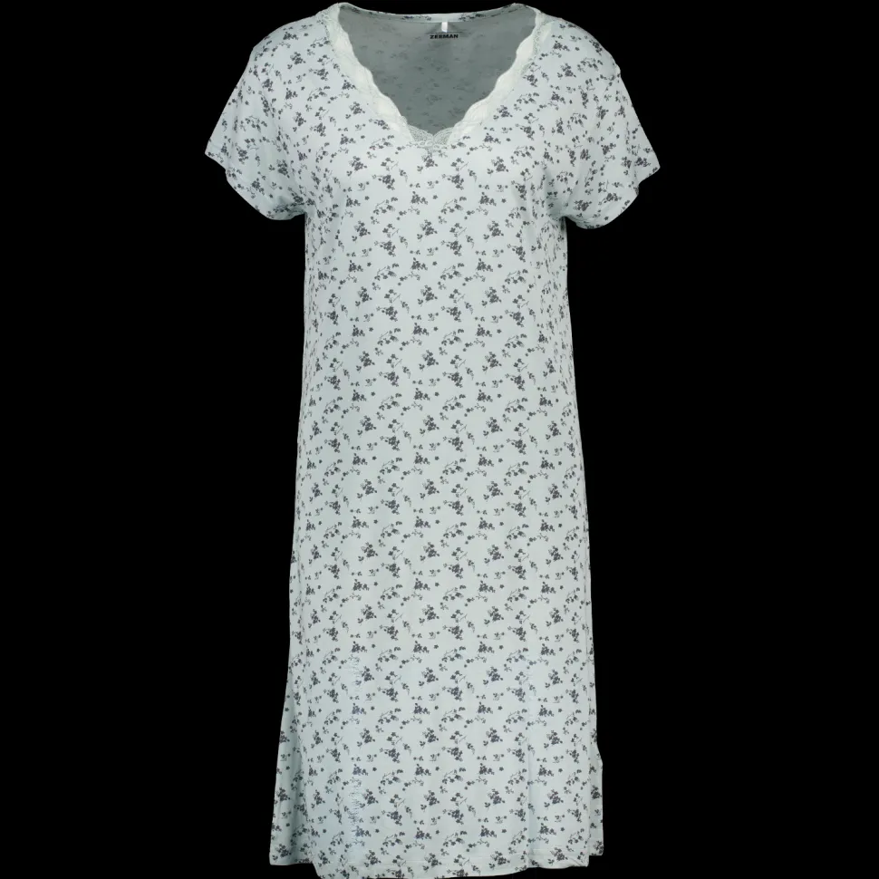 Zijdeachtig nachthemd in een frisse groene kleur met een all-over print. Gemaakt van 100% viscose, wat zorgt voor een comfortabele en ademende feel. Het prachtige kant bij de V-hals en de korte mouwen maken het een fijn stuk om in te ontspannen. Dit nachthemd is een fijne keuze voor de nacht.