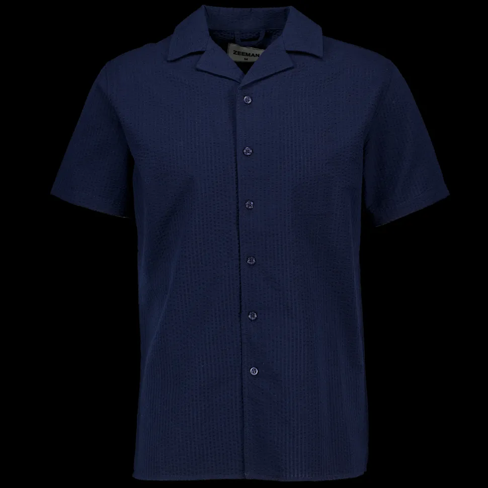 Dit overhemd voor mannen is uitgevoerd in een frisse blauwe kleur en gemaakt van een mix van 60% katoen en 40% polyester. Het seersucker materiaal zorgt voor een luchtige draagervaring. Het korte mouwdesign is praktisch en biedt comfort. Ideaal voor de warmere dagen.