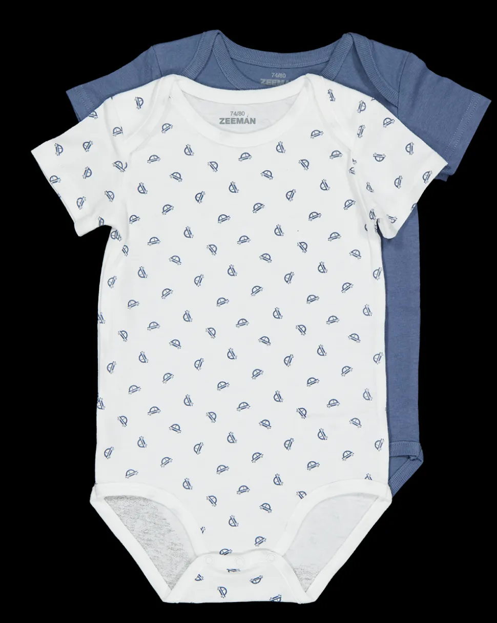 Deze romper is gemaakt van 100% katoen en geschikt voor baby's. De set bevat een blanco romper in de kleur blauw en een witte romper met een print in blauw. Beide hebben korte mouwen en zijn geschikt voor zowel jongens als meisjes.