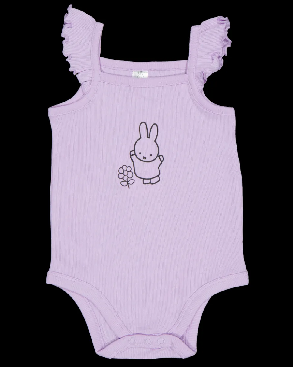 Deze paarse romper voor baby’s is gemaakt van katoen met een beetje elastaan. De romper heeft korte mouwtjes met een ruche en een drukknoopsluiting onderaan. Het uniseks model is makkelijk aan en uit te trekken en biedt comfort doordat het zacht en rekbaar is.