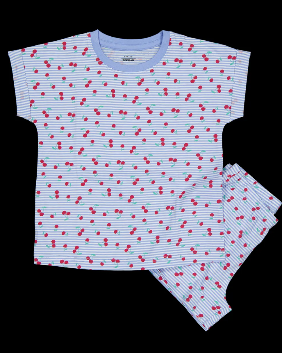 Deze shortama voor meisjes heeft korte mouwen en is gemaakt van 100% katoen. De stof is lichtblauw gestreept met een patroon van kleine rode kersen. De korte mouwen zorgen voor draagcomfort bij warme temperaturen.