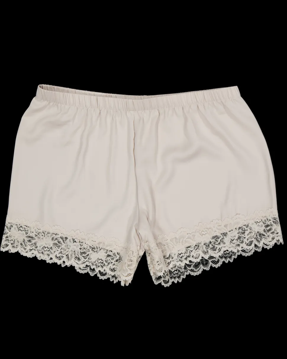 Deze shortama voor vrouwen is mouwloos en gemaakt van satijn in de kleur roze. Het materiaal bestaat uit polyester met kant van polyamide en elastaan. De combinatie zorgt voor een zachte stof met een licht elastische kantafwerking.