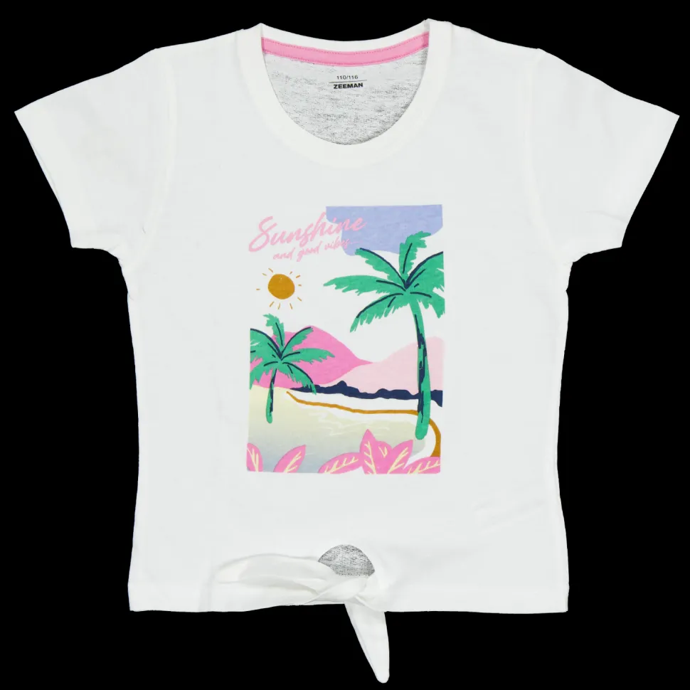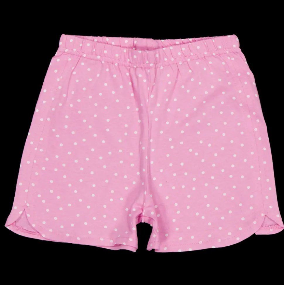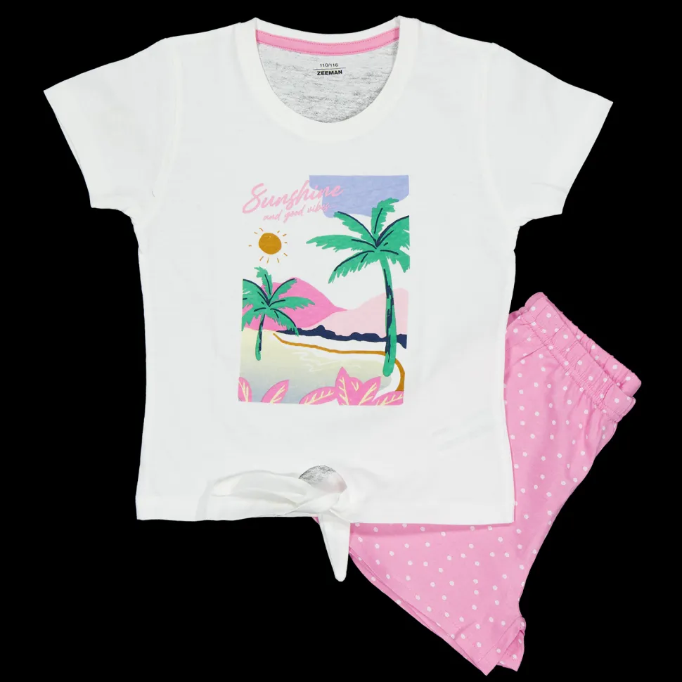 Dit setje korte pyjama's is geschikt voor meisjes. Het bovenstuk is wit en heeft een vrolijke print met palmbomen en de tekst 'Sunshine'. De roze broek heeft stippen en een elastische tailleband voor comfort. Gemaakt van 100% katoen, zacht en licht. Ideaal voor een goede nachtrust.