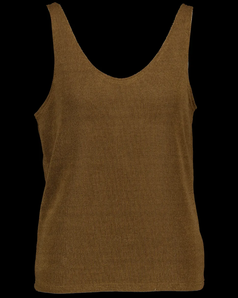 Deze singlet voor vrouwen heeft een bruine kleur en is gemaakt van een gebreide stof. De samenstelling van polyester en elastaan zorgt voor een lichte rek en comfortabele pasvorm. Je draagt deze singlet los of als basislaag onder andere kledingstukken.