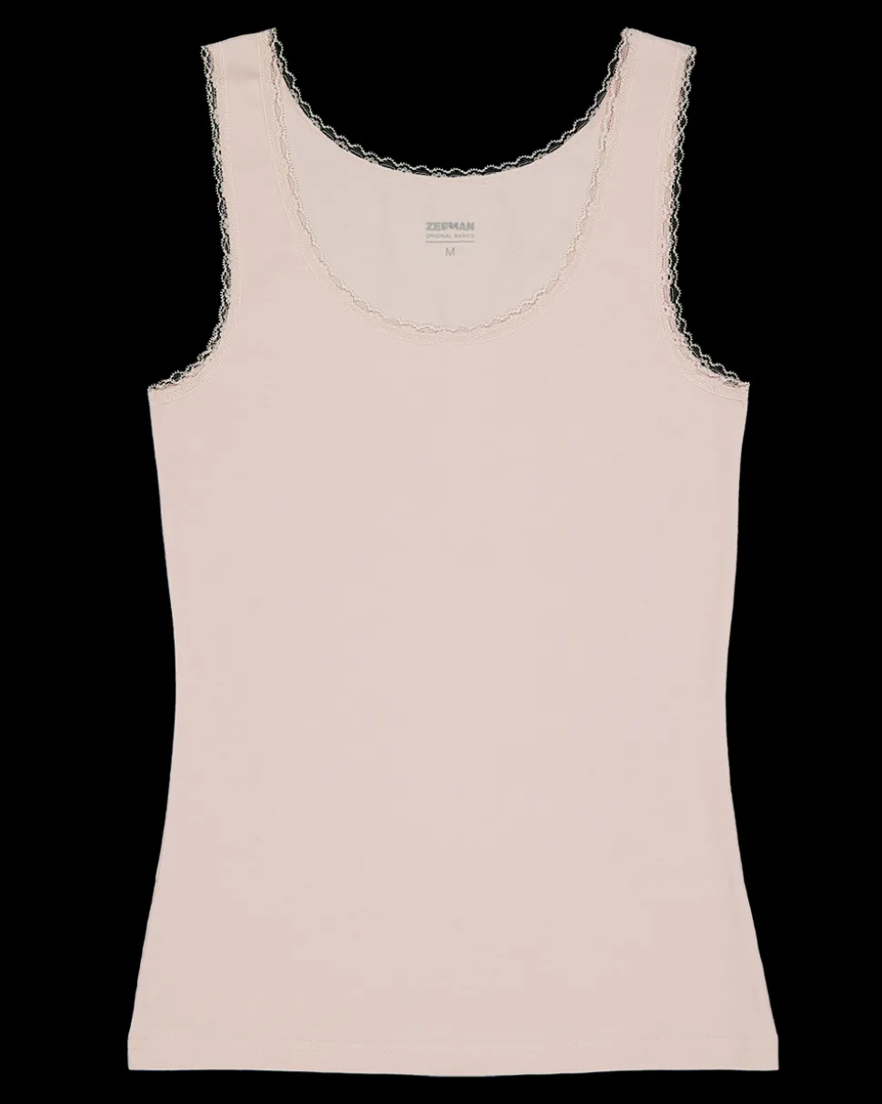 Deze singlet voor vrouwen heeft een zachte kleur roze en een eenvoudige, rechte pasvorm. De singlet heeft een ronde hals met een subtiele kanten rand, wat voor een licht detail zorgt zonder te opvallend te zijn. Je kunt het dragen als basislaag.