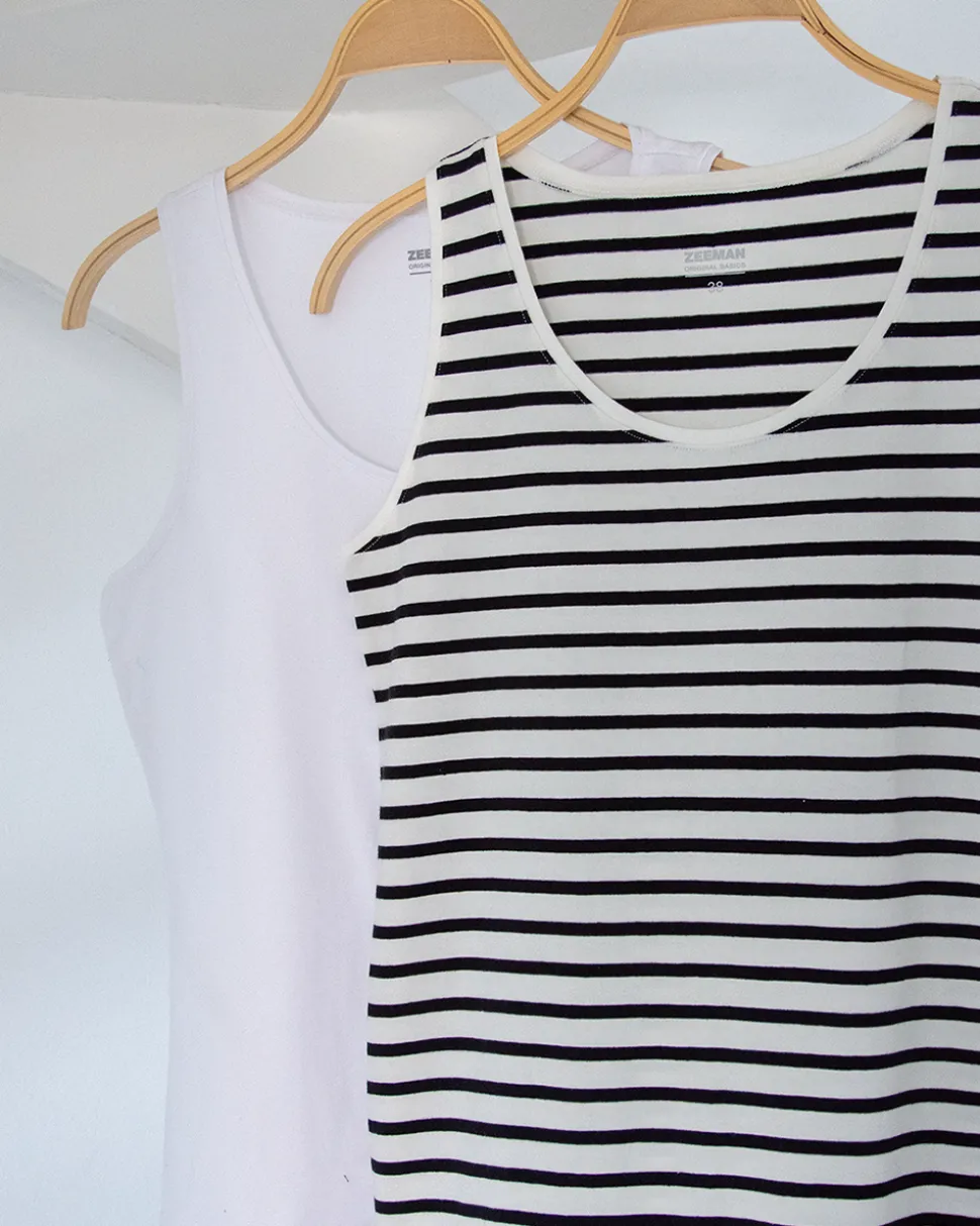 Dit singlet is gemaakt van 95% katoen en 5% elastaan, wat zorgt voor een fijn draagcomfort en een goede pasvorm. De witte achtergrond met zwarte strepen geeft een frisse uitstraling. Het heeft een ronde halslijn, ideaal voor verschillende outfits. Verkrijgbaar in een handige verpakking van één.