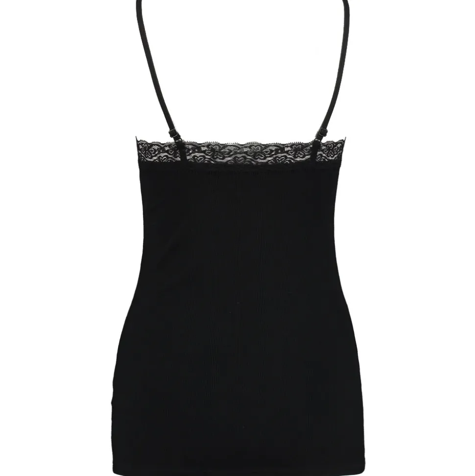 Deze zwarte singlet voor vrouwen is gemaakt van katoen met een klein deel elastaan. Het materiaal zorgt voor een comfortabele pasvorm door de licht rekbare eigenschap. Dit kledingstuk heeft smalle bandjes en een rand met kant voor een eenvoudig, netjes uiterlijk.