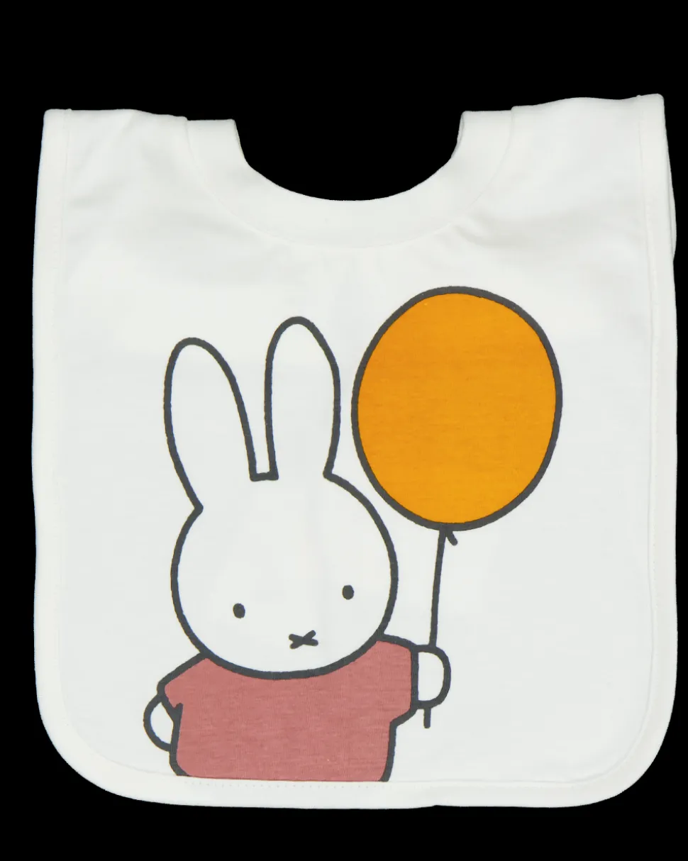 Deze slab in de kleur wit is geschikt voor baby’s en heeft een afbeelding van Nijntje met een oranje ballon. De slab is gemaakt van 100% katoen en biedt een zachte en huidvriendelijke bescherming tijdens het eten.