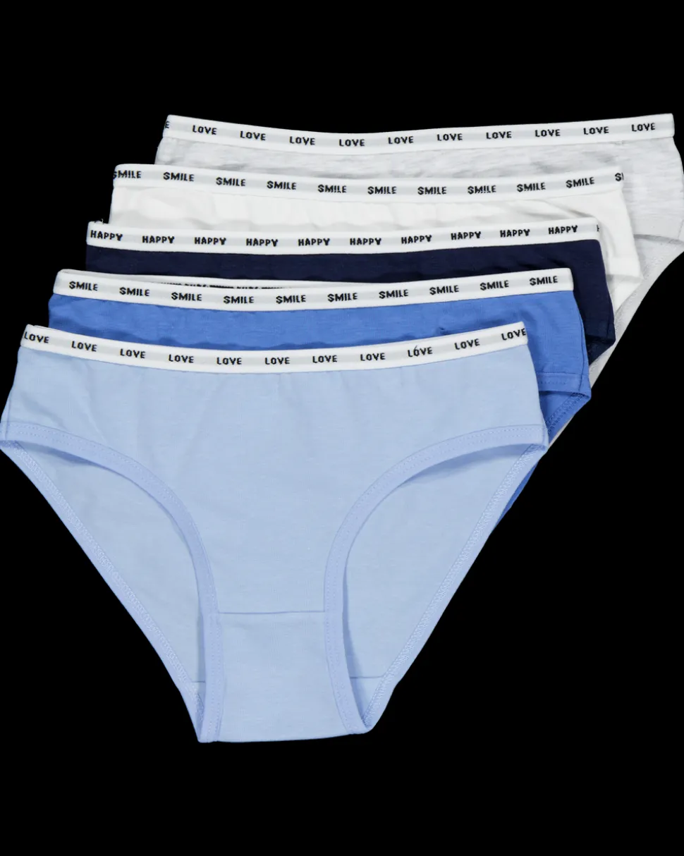 Deze slips voor meisjes zijn gemaakt in verschillende tinten blauw en wit. Ze hebben een elastische band met tekst. Door de afwisseling in kleuren heb je altijd een passende slip bij je kleding. De stoffen zorgen voor een comfortabel draaggevoel.