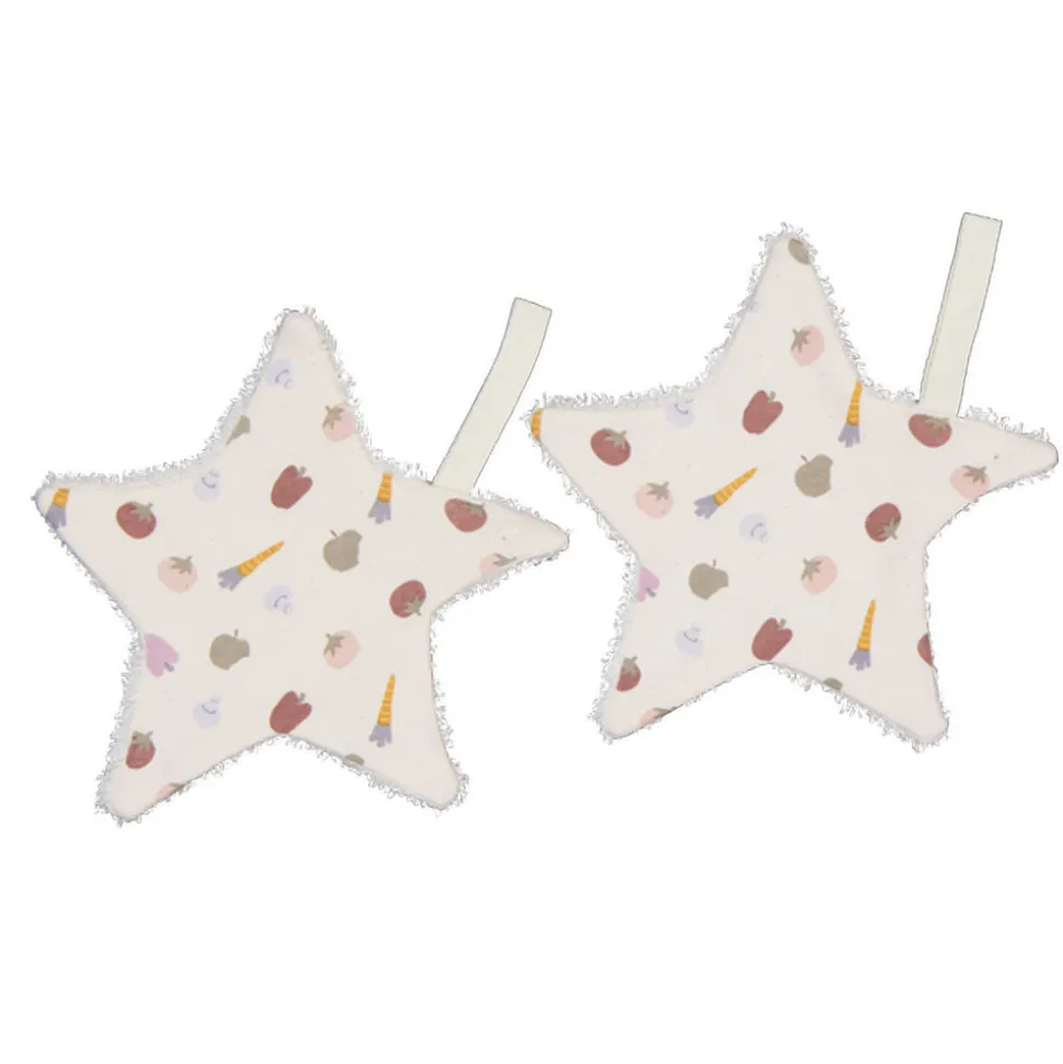 Deze speenclip in wit heeft een leuke stervorm en een vrolijk all-over print met kleurrijke afbeeldingen van fruit en ijsjes. De voorkant is gemaakt van 100% katoen. Het is een handige clip die ervoor zorgt dat de speen niet op de grond valt. Zo blijft alles veilig en schoon.