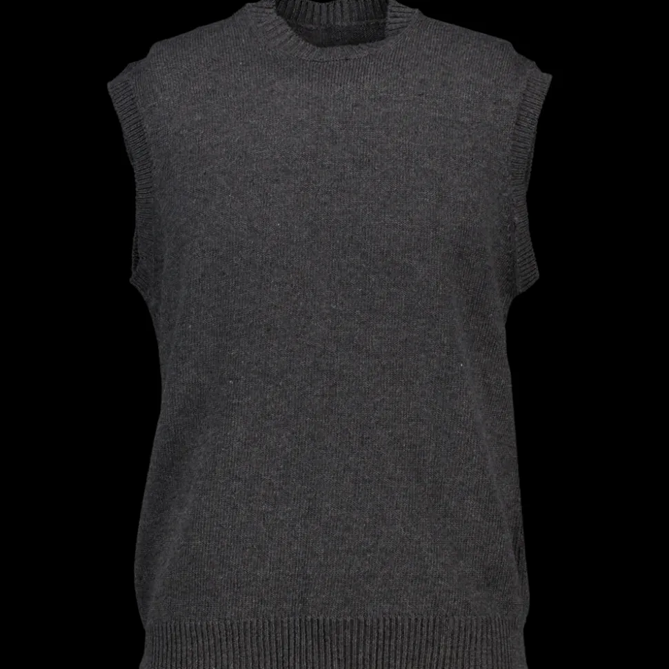 Deze fijngebreide spencer in de kleur antraciet heeft een rechte pasvorm en een ronde hals met ribboord. De spencer is gemaakt met verschillende gerecyclede materialen, waaronder acryl, viscose en katoen. Draag de spencer over een overhemd of T-shirt. Ook verkrijgbaar in een zandkleur.