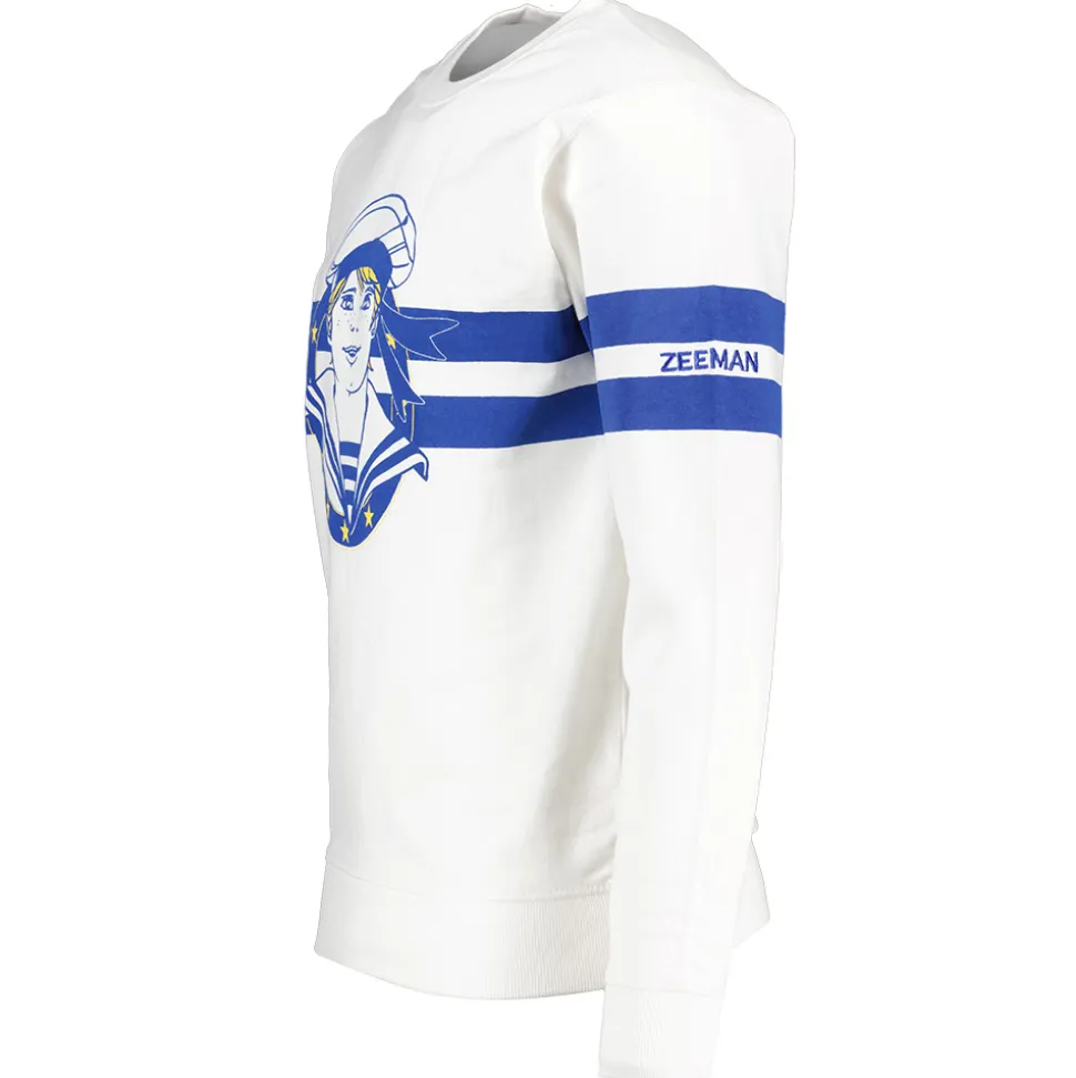 Een statement maken met de kleding die je draagt. Dat kan met de artikelen uit onze fancollectie. Deze witte Zeeman sweater heeft een grote opdruk van Koos Matroos op de voorkant. Rond de uiteinden van de mouwen en de onderkant van de trui lopen ribboorden met versmalde openingen. Hierdoor sluiten deze delen van de trui mooi en goed aan. De stof is voor 50% gemaakt van katoen en voor 50% van polyester. Door de combinatie van katoen en polyester voelt de stof lekker zacht en warm aan. 12,5 jaar geleden introduceerde Zeeman het eerste artikel voor de echte fans. Nu brengen we de klassiekers terug, samen met een aantal nieuwe Zeeman fanshop-items.