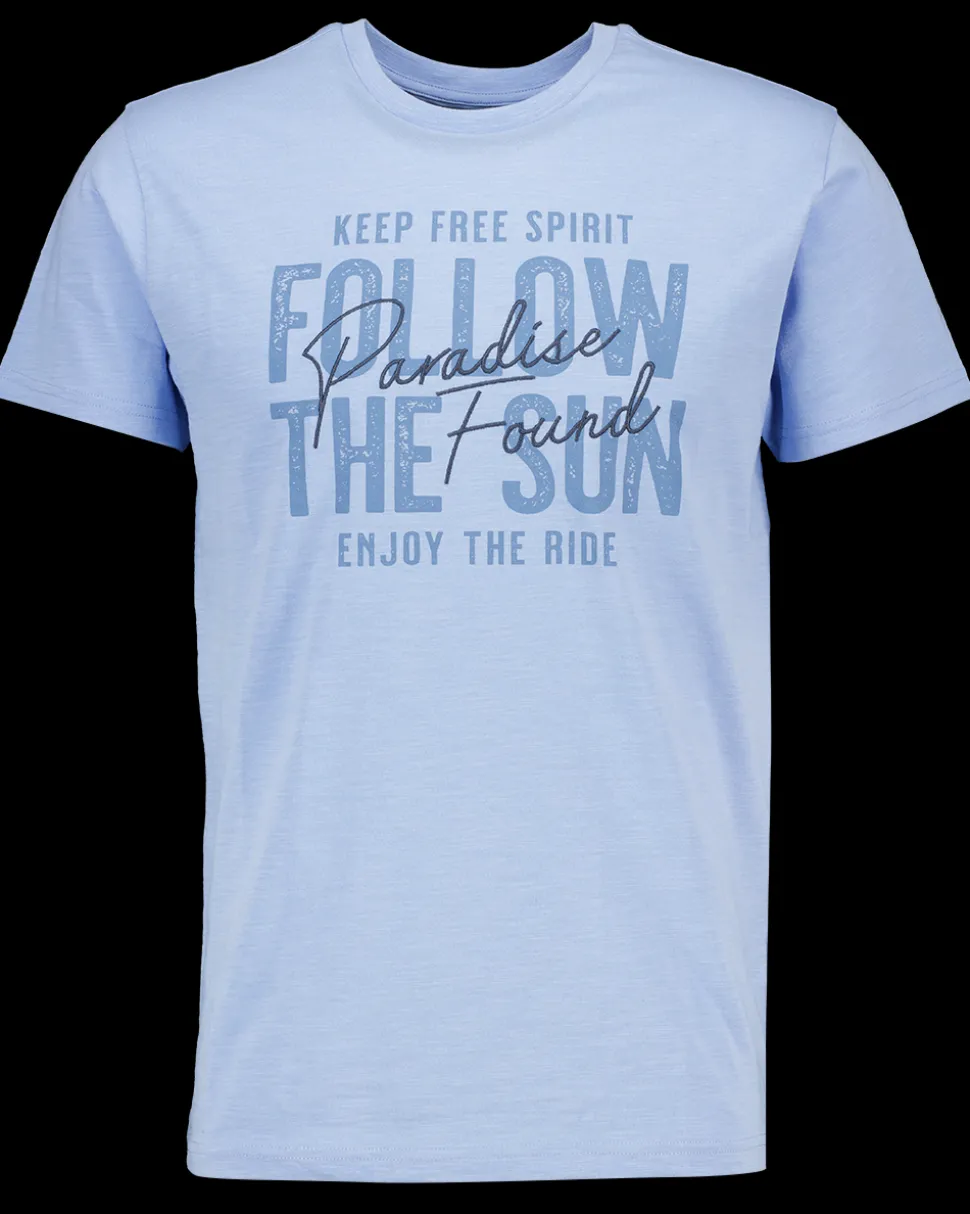 Deze blauwe T-shirt voor mannen is gemaakt van 100% katoen. Het heeft korte mouwen en een ronde hals. De katoensamenstelling maakt het prettig om te dragen bij warm weer. De tekstprint op de voorkant geeft de T-shirt een casual uitstraling.