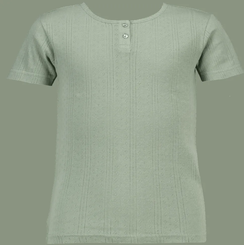 Dit groene T-shirt voor meisjes is gemaakt van 100% katoen, wat zorgt voor een zacht en ademend gevoel. Het shirt heeft een ronde hals met knoopjes aan de voorkant en korte mouwen. De stof heeft een fijne pointelle structuur, waardoor het een speelse uitstraling krijgt. Dit T-shirt is ideaal voor iedere dag.