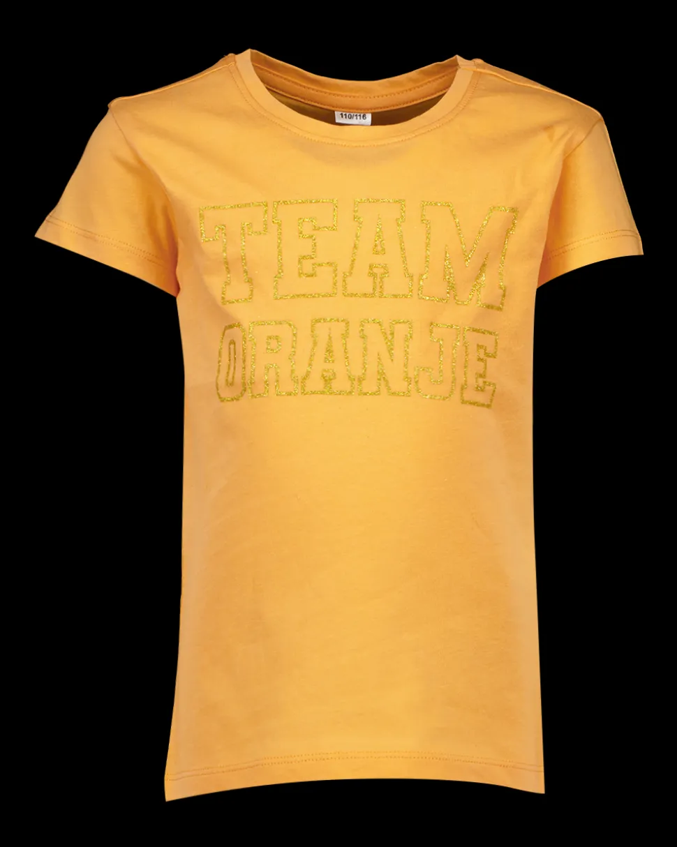 Deze oranje T-shirt voor meisjes is gemaakt van 100% katoen. Het heeft korte mouwen en een ronde hals. Op de voorkant staat de tekst 'TEAM ORANJE' in bijpassende kleur. Het zachte materiaal zorgt voor een comfortabele draagervaring.