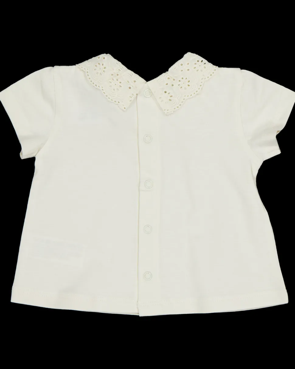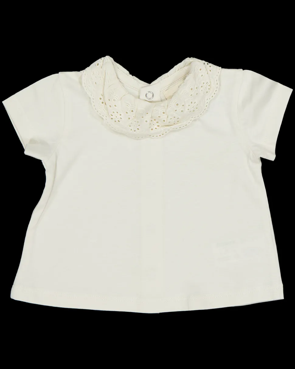 Dit T-shirt voor meisjes is gemaakt van 100% katoen, wat zorgt voor een zachte en ademende kwaliteit. Het heeft een ronde hals met een schattige ruffle en een drukknop sluiting aan de achterkant voor eenvoudig aankleden. Verkrijgbaar in de kleur wit, ideaal voor elke kindergarderobe.