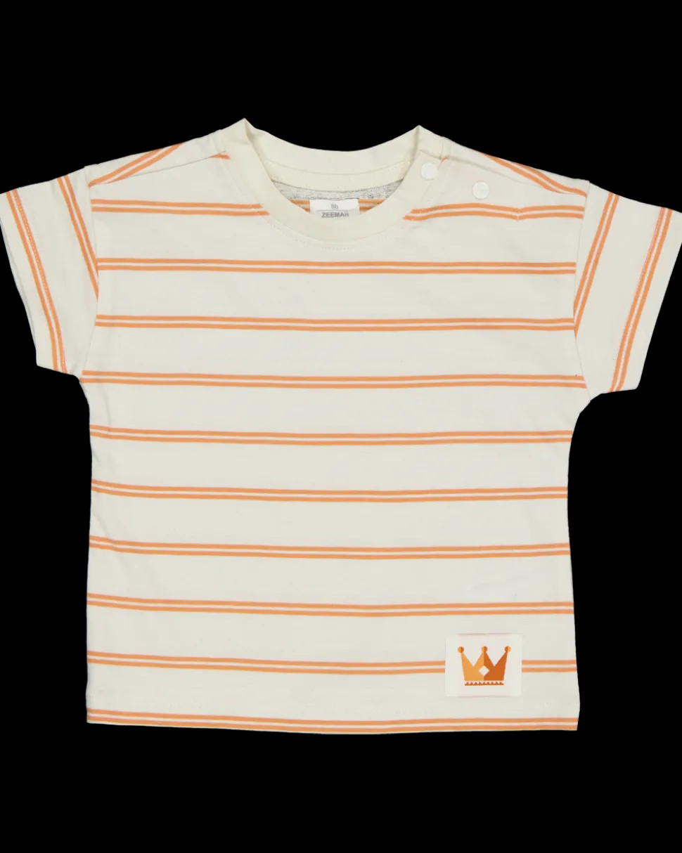Dit unisex T-shirt voor baby's is gemaakt van 100% katoen, wat zorgt voor een zacht en comfortabel gevoel op de huid. Het shirt heeft een witte basis met vrolijke oranje strepen. De drukknoopsluiting bij de schouder maakt aan- en uittrekken eenvoudig en snel. Dit item is praktisch voor jouw kleintje.