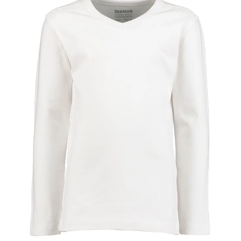 Dit witte T-shirt voor kinderen heeft lange mouwen en een V-hals. Het is gemaakt van 95% katoen en 5% elastaan, wat zorgt voor een comfortabele pasvorm en voldoende bewegingsvrijheid. Het T-shirt is geschikt voor jongens en meisjes.