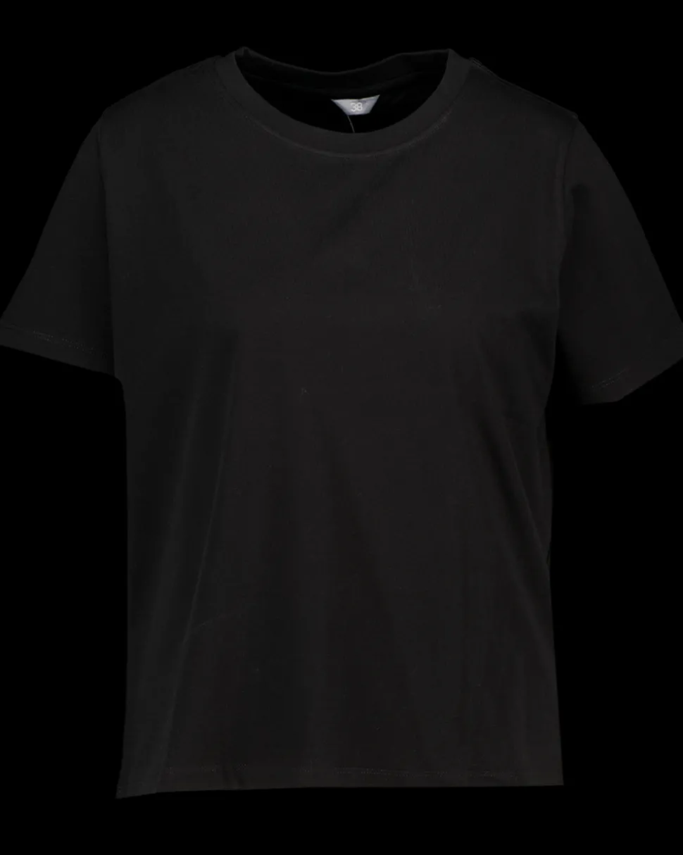 Dit zwarte T-shirt voor vrouwen heeft korte mouwen en een ronde hals. Het is gemaakt van 100% katoen, wat zorgt voor een comfortabele en ademende pasvorm. Door de eenvoudige uitstraling is het geschikt voor diverse combinaties binnen je kleding.