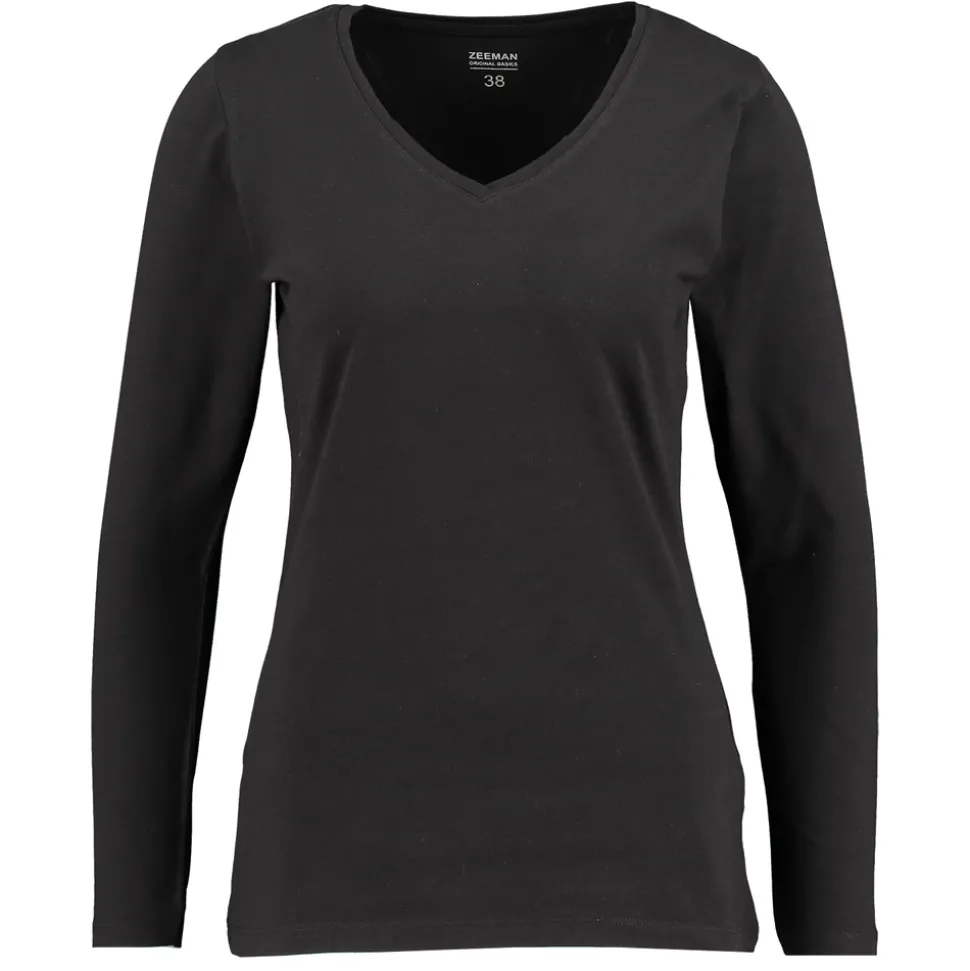 Deze zwarte T-shirt voor vrouwen heeft een lange mouw en een V-hals. Het materiaal bestaat voor 95% uit katoen en 5% uit elastaan, wat zorgt voor een prettige pasvorm en draagcomfort. De T-shirt is geschikt voor verschillende gelegenheden.