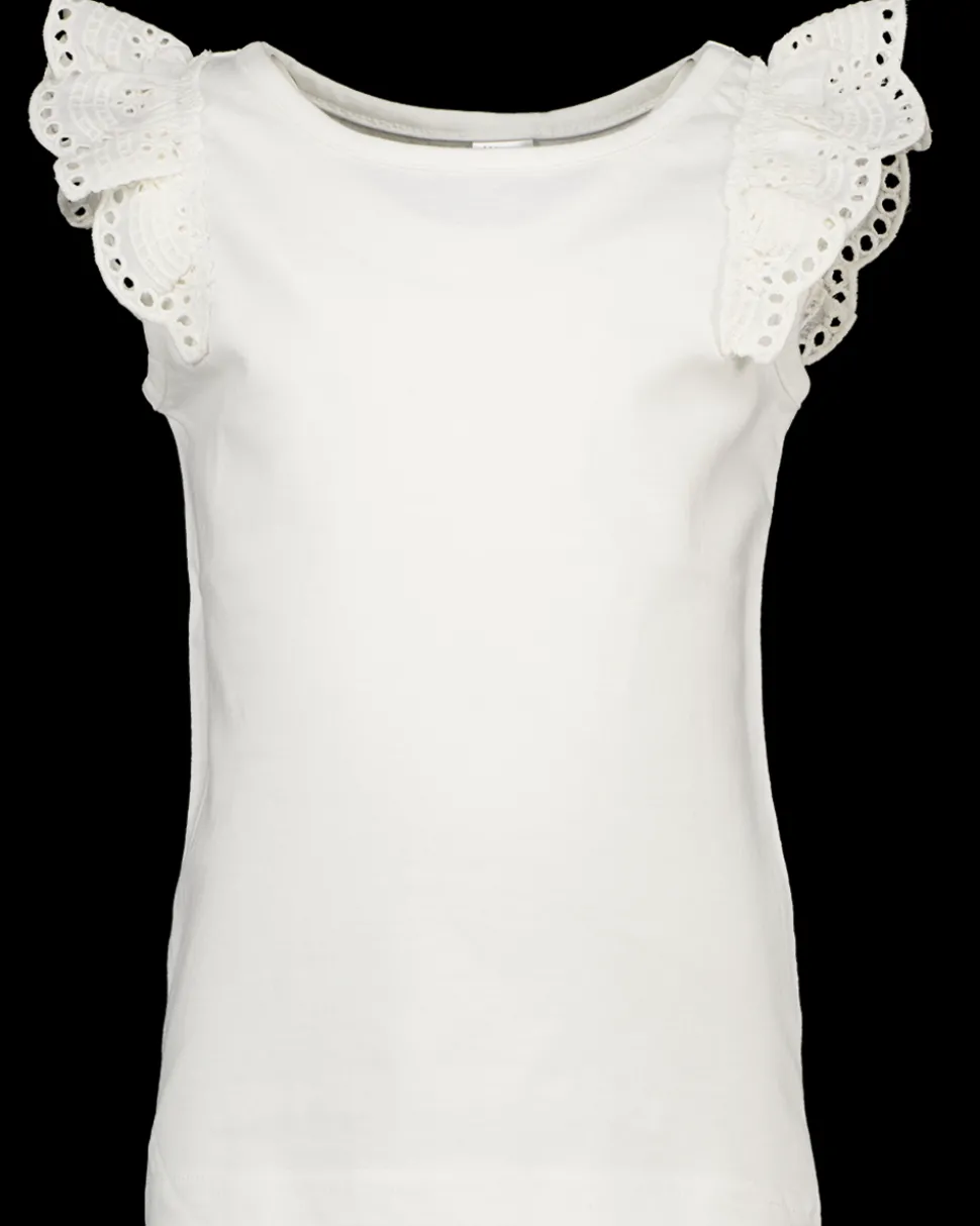 Deze witte top voor dames is gemaakt van 100% katoen. De korte mouwen hebben een opengewerkt kantdetail. De stof voelt zacht aan en biedt een comfortabele pasvorm. De top is geschikt voor warme dagen en combineert met verschillende kledingstukken.