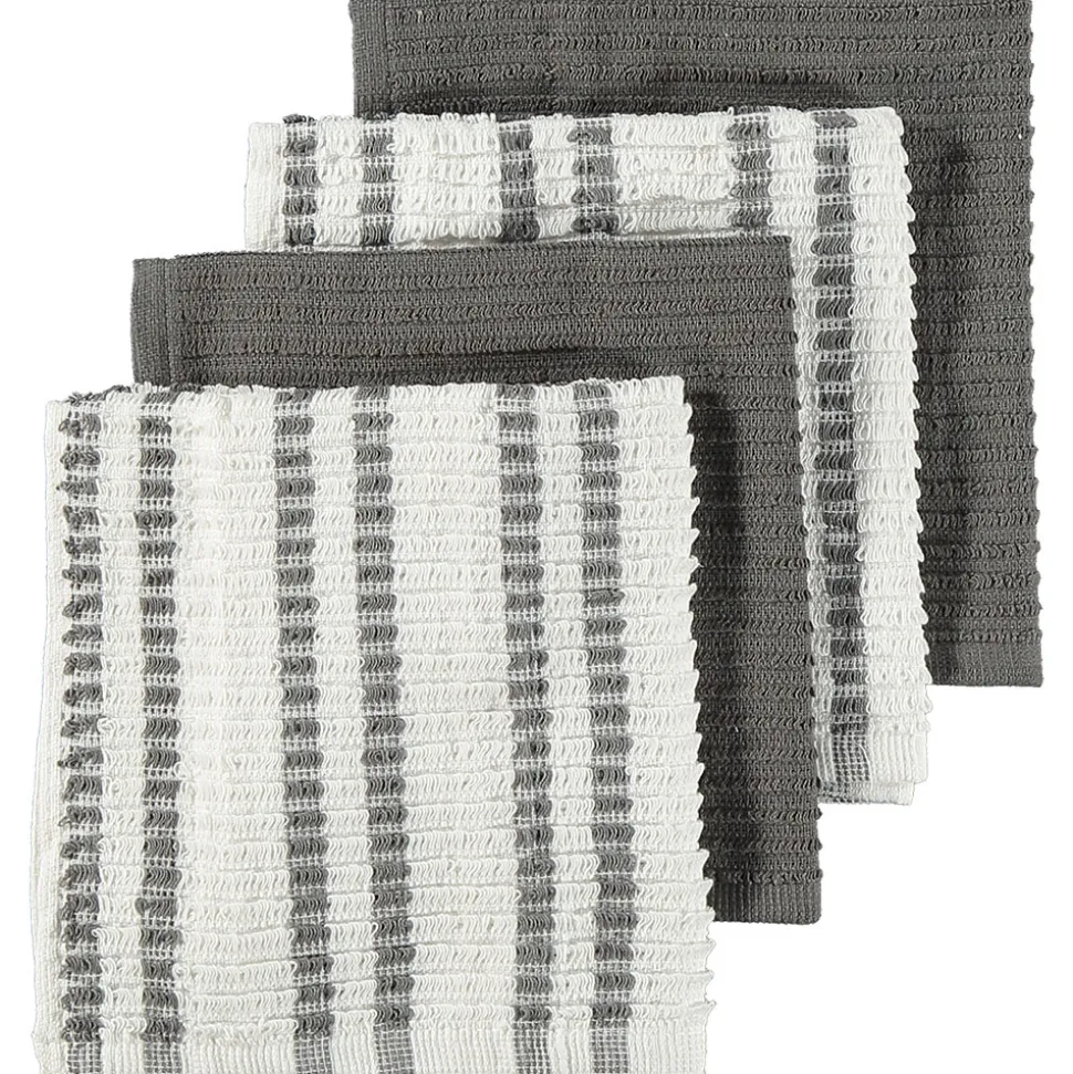 Deze vaatdoek in de kleur grijs is gemaakt van 100% katoen. De set bevat vier doeken die je kunt gebruiken om af te wassen of oppervlakken schoon te maken. Dankzij de katoenen stof nemen ze vocht goed op en zijn ze gemakkelijk te wassen.