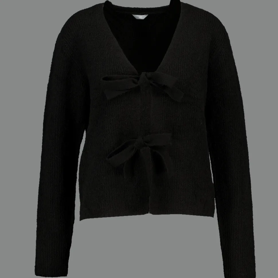 Deze zwarte cardigan voor vrouwen is gemaakt van een combinatie van acryl, polyester en elastaan, wat zorgt voor een zachte en comfortabele pasvorm. De V-hals en de strikdetails maken het een eenvoudig item dat je makkelijk kunt combineren. Geschikt om je look een gezellige touch te geven.