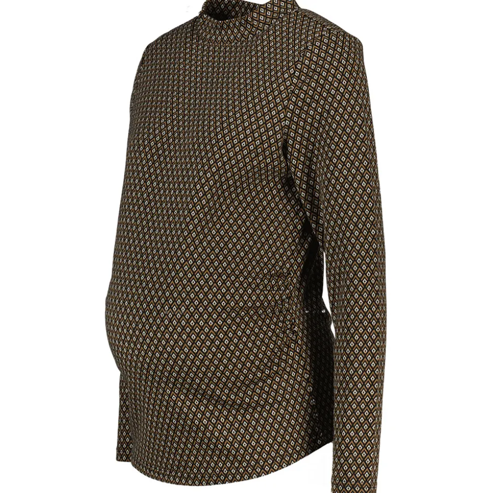 Op zoek naar een fijne zwangerschapstop van goede kwaliteit? Deze bruine top met lange mouwen is ruimer gemaakt rondom de buik met extra stof en plooien. Hierdoor knelt het shirt niet wanneer de baby groeit en de buik groter wordt. De ingeweven print zorg voor een unieke uitstraling. Onze zwangerschapskleding groeit met je buik mee. Je kunt daarom gewoon je normale maat kiezen, zonder te letten op je taille.