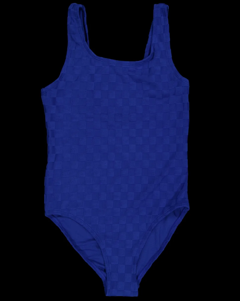 Deze blauwe badpak voor meisjes heeft een geruit breiselpatroon. Het materiaal bestaat uit polyester en elasthaan, wat zorgt voor rek en draagcomfort. De badpak is geschikt voor tienermeisjes en heeft een eenvoudige pasvorm met brede schouderbanden.