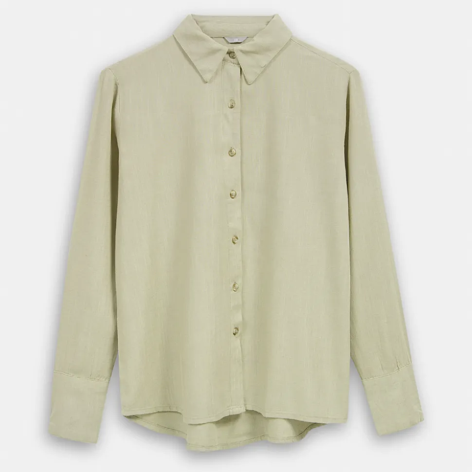 Deze blouse voor vrouwen heeft lange mouwen en een knoopsluiting. De stof bestaat voor het grootste deel uit viscose met linnen, wat zorgt voor een lichte en ademende kwaliteit. De kleur is groen en het model heeft een losse pasvorm.