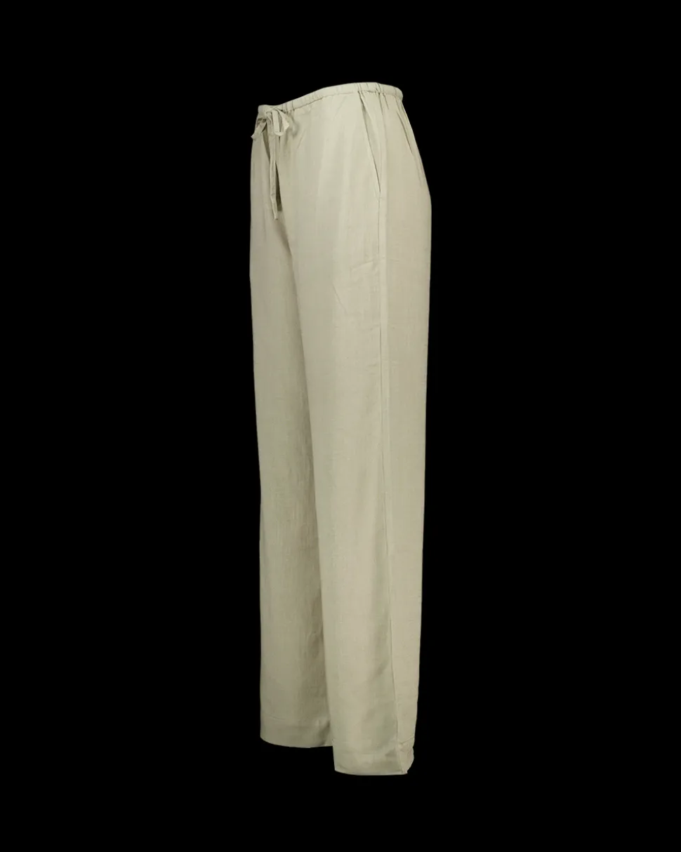 Deze groene broek is gemaakt van 85% viscose en 15% linnen, wat zorgt voor een lichte en ademende stof. De elastische tailleband met strik zorgt voor een comfortabele fit. De broek heeft een losse pasvorm, waardoor je vrij kunt bewegen. Handig voor verschillende looks.