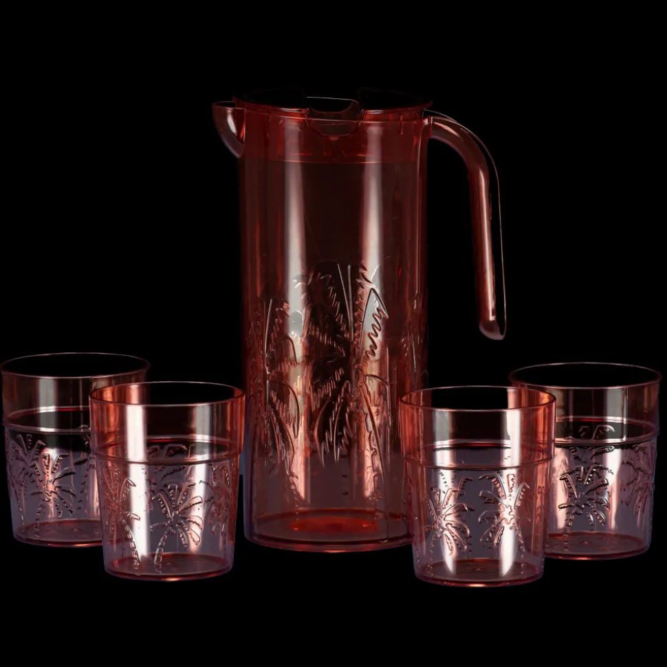 Deze set drinkglazen in oranje is ideaal voor je dagelijkse drankjes. De set bevat een kan en vier glazen, waardoor je makkelijk een drankje voor meerdere mensen kunt inschenken. Het vrolijke ontwerp met een subtiele structuur maakt deze set een leuke aanvulling op je tafel.