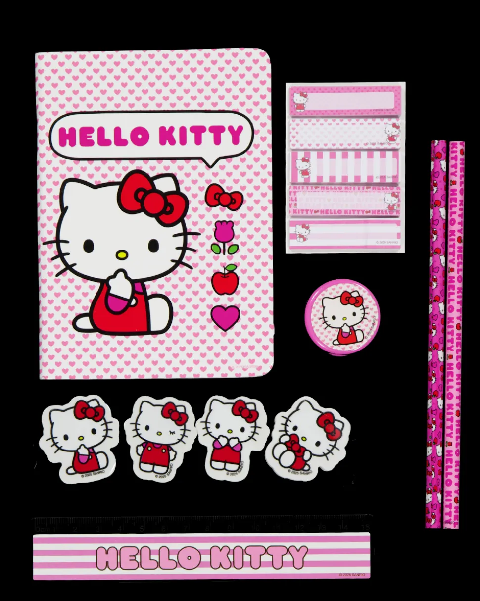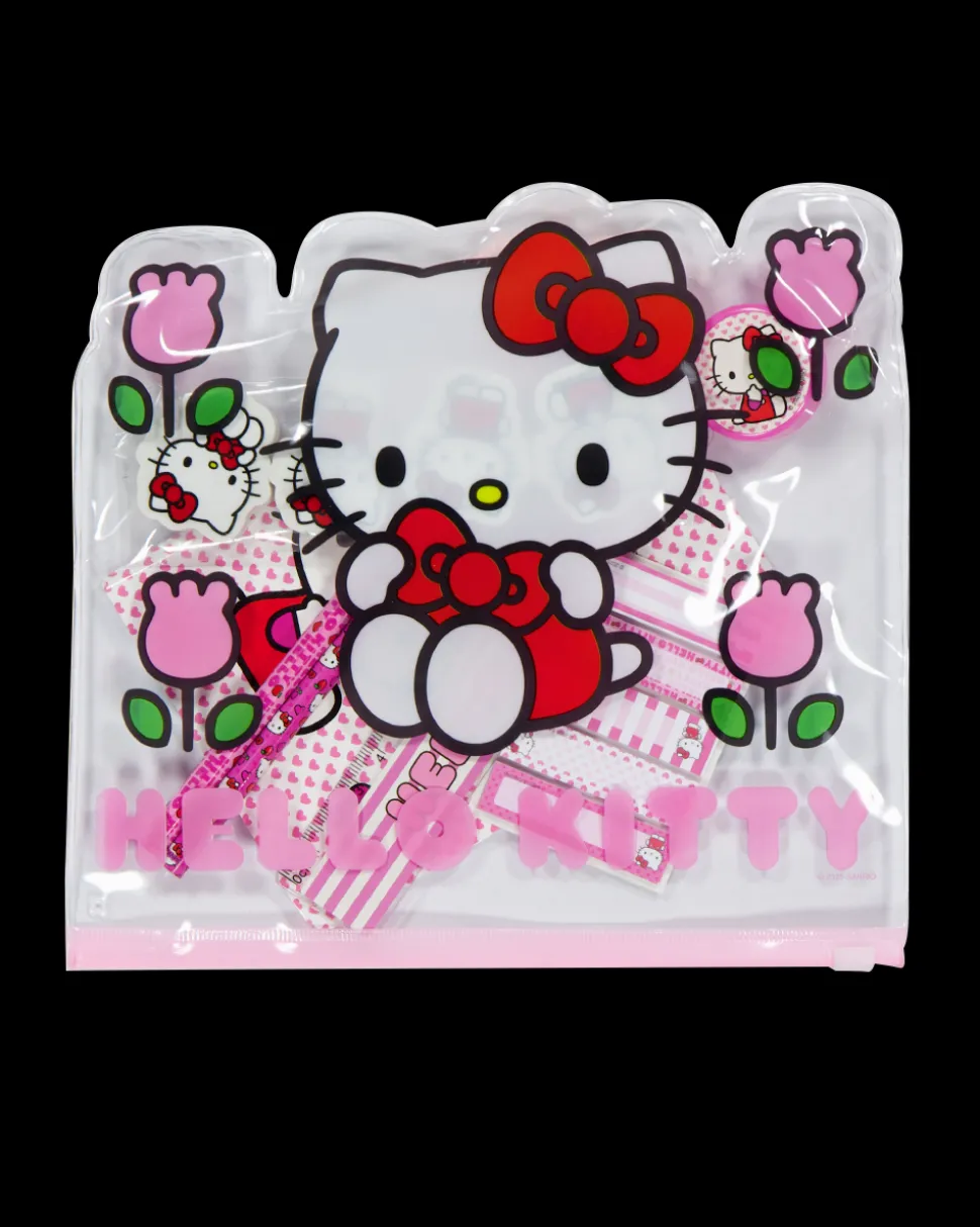 Deze roze etuitas van Hello Kitty heeft verschillende kleine accessoires met kattenprint. Je kunt hier pennen, potloden en andere schrijfbenodigdheden in bewaren. De etuitas is compact en handig voor gebruik op school of thuis.