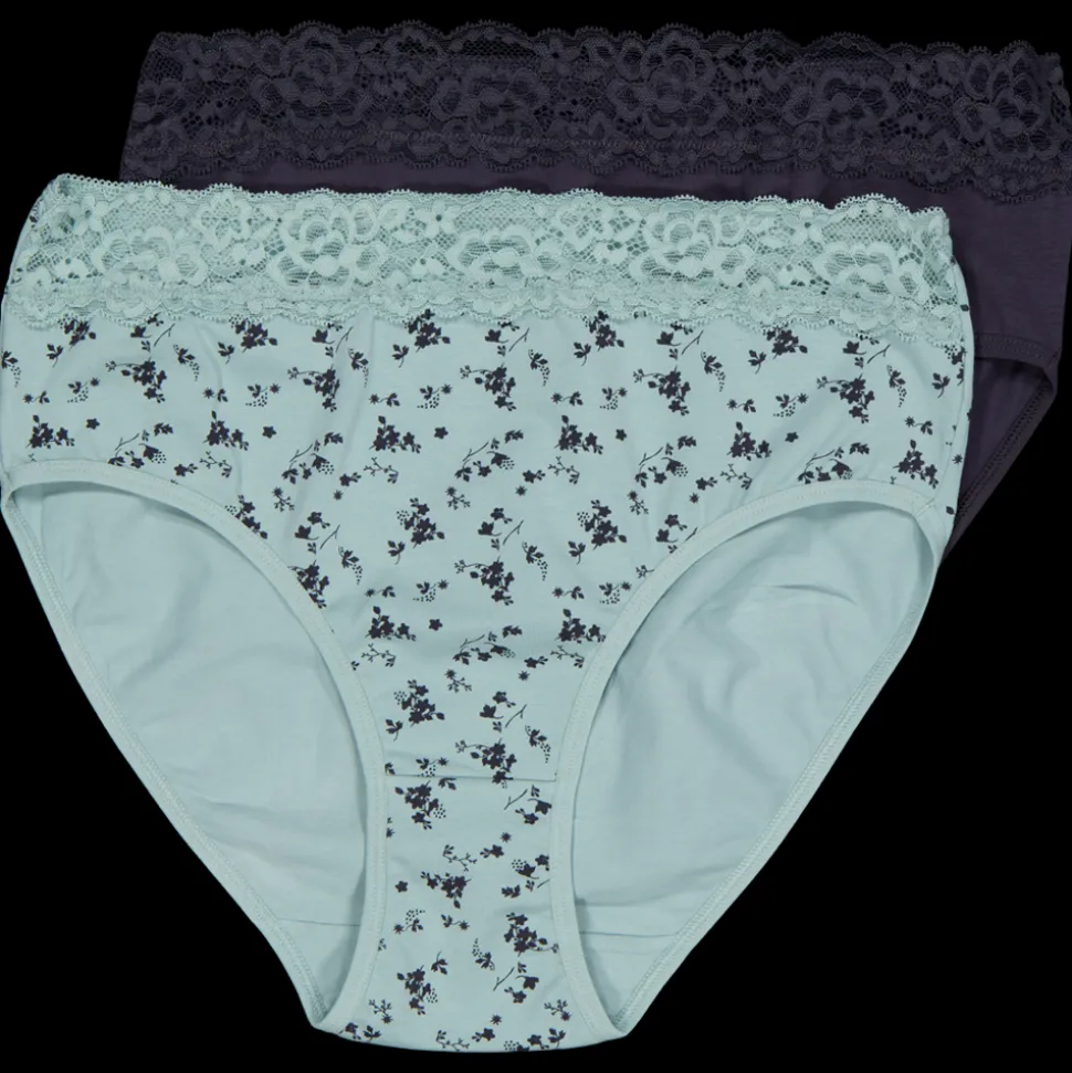 Deze hipster panties in groen zijn gemaakt voor volwassenen en komen in een handige verpakking van twee. Ze hebben een comfortabele pasvorm en een elastische band met een mooie kantafwerking. De combinatie van een effen en een bloemenprint maakt ze veelzijdig en geschikt voor verschillende outfits.