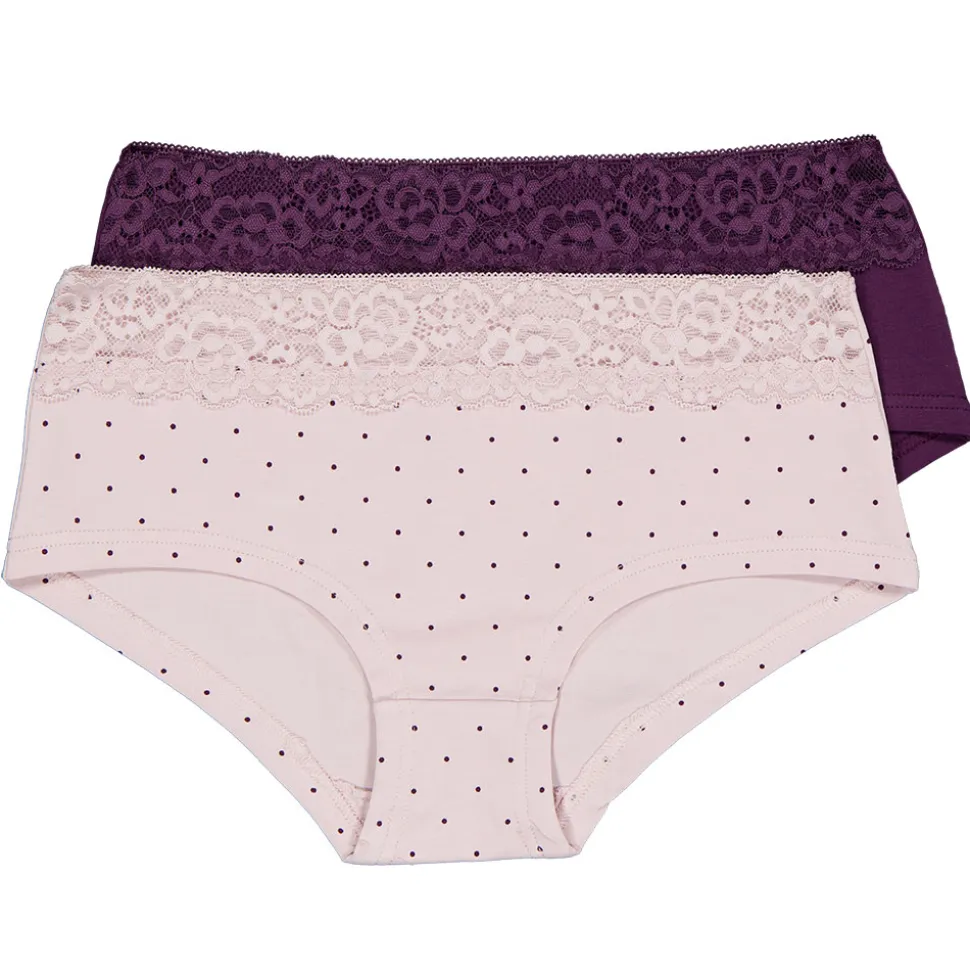 Deze set hipster onderbroeken voor vrouwen bevat twee comfortabele stukken in paarse en lichtgekleurde varianten met stippen. De zachte stof zorgt voor een fijne pasvorm, terwijl de kant aan de bovenrand een fraaie uitstraling biedt. Ideaal voor elke gelegenheid waarbij je comfort wilt combineren met een leuke stijl.