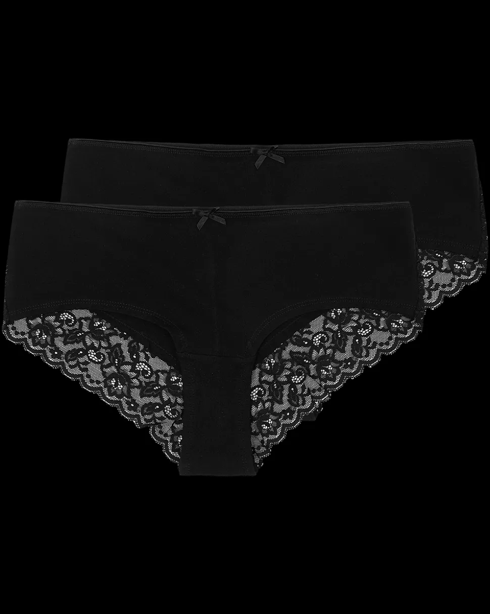 Deze zwarte hipsters voor vrouwen worden geleverd per twee stuks. Ze zijn gemaakt van katoen met een beetje elastaan, wat zorgt voor een comfortabele pasvorm. De hipsters hebben een kanten randje voor een extra detail zonder in te leveren op draagcomfort.