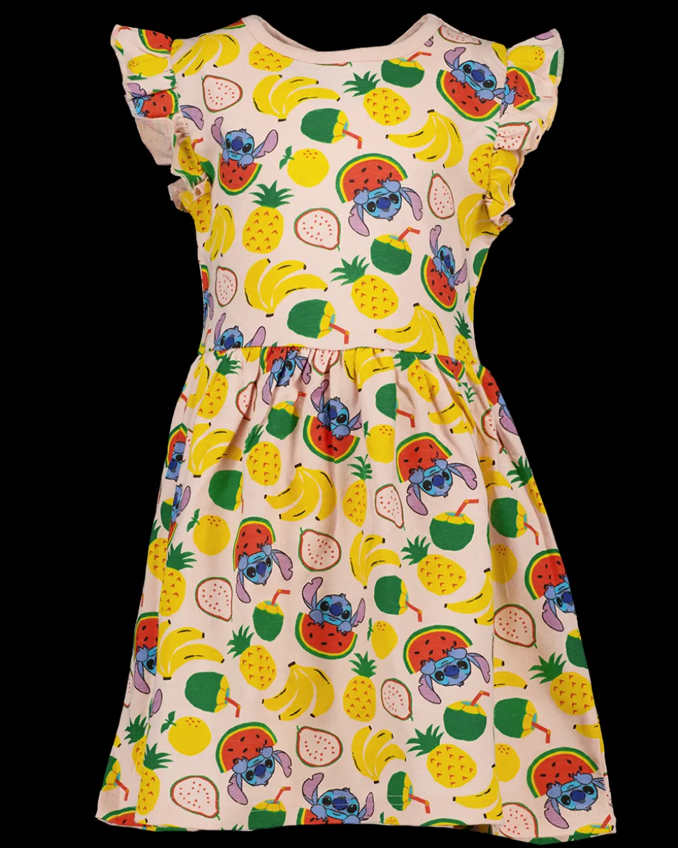 Deze jurk voor meisjes heeft korte mouwen met geplooide accenten en een opstaand boordje. De jurk is roze en bedrukt met kleurrijke fruit- en dierenmotieven. Het materiaal bestaat voor 100% uit katoen, wat zorgt voor draagcomfort en ademend vermogen.
